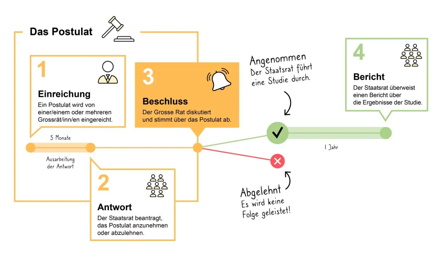 Das Postulat verpflichtet den Staatsrat, eine Studie zu einer bestimmten Frage durchzuführen und dazu einen Bericht vorzulegen.