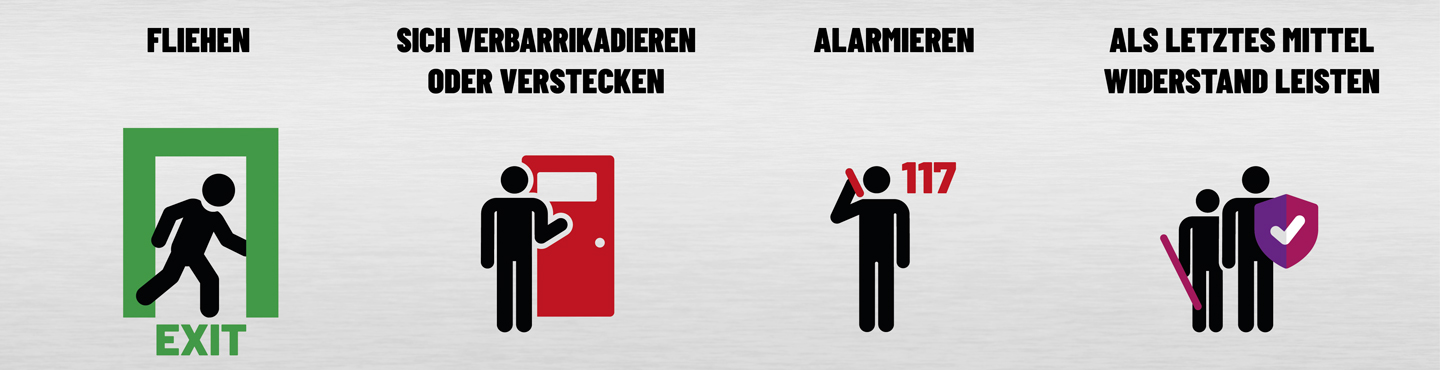 Angesichts der verschiedenen Orte, an dem ein AMOK-Angriff stattfinden kann, sind diese Handlungsempfehlungen an jedem öffentlichen Ort, in offener oder geschlossener Umgebung und sogar in Unternehmen anwendbar.Es wird dringend empfohlen, sich auf das Verhalten im Falle eines Angriffs vorzubereiten. Aber auch andere Präventionsmassnahmen sollten beachtet werden, wie zum Beispiel das Erkennen potenzieller Täter/innen und die Anpassung der Infrastruktur.
