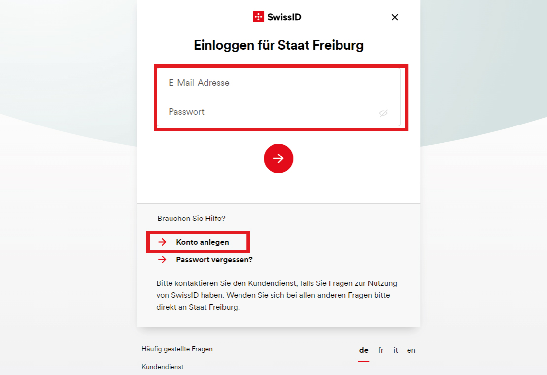 - Ein bestehendes SwissID-Konto verwenden oder ein neues SwissID-Konto erstellenBeachten Sie, dass die SwissID-Version, die Sie zum Anmelden verwenden, keine Identitätsprüfung erfordert. Es ist also durchaus möglich, dass Sie ein SwissID-Konto speziell für den Zugriff auf FRIAC erstellen.