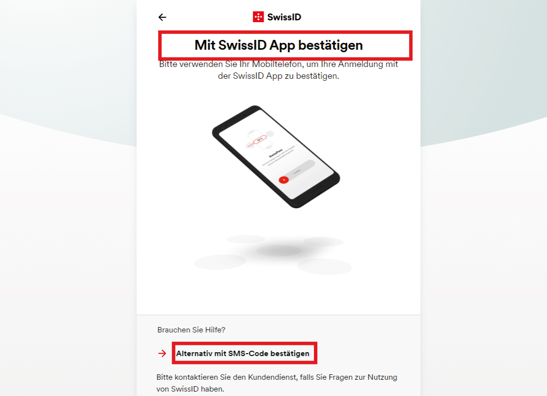 - Bestätigen Sie den Zugang mit der SwissID App auf Ihrem Smartphone oder lassen Sie sich einen Code per SMS schicken