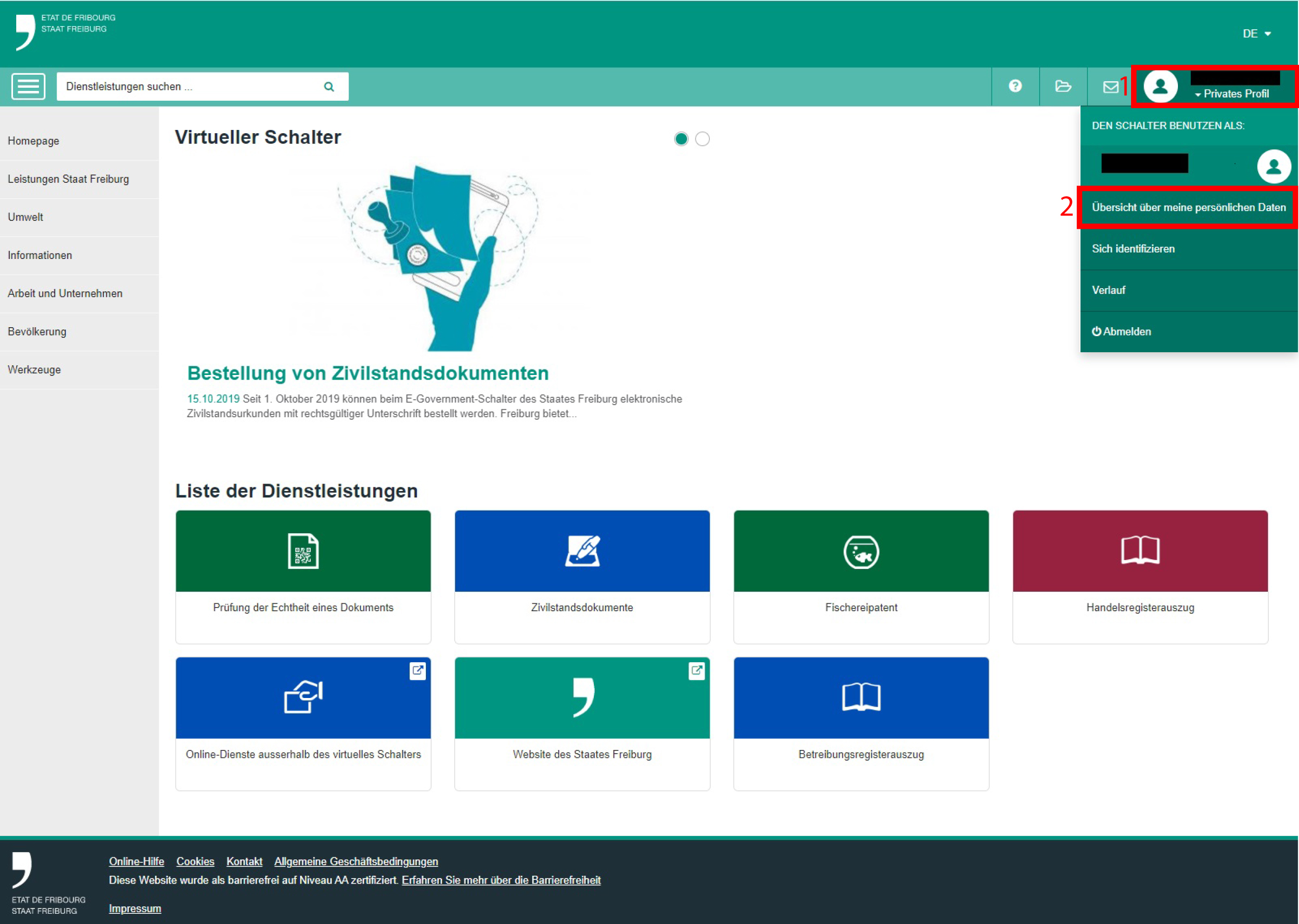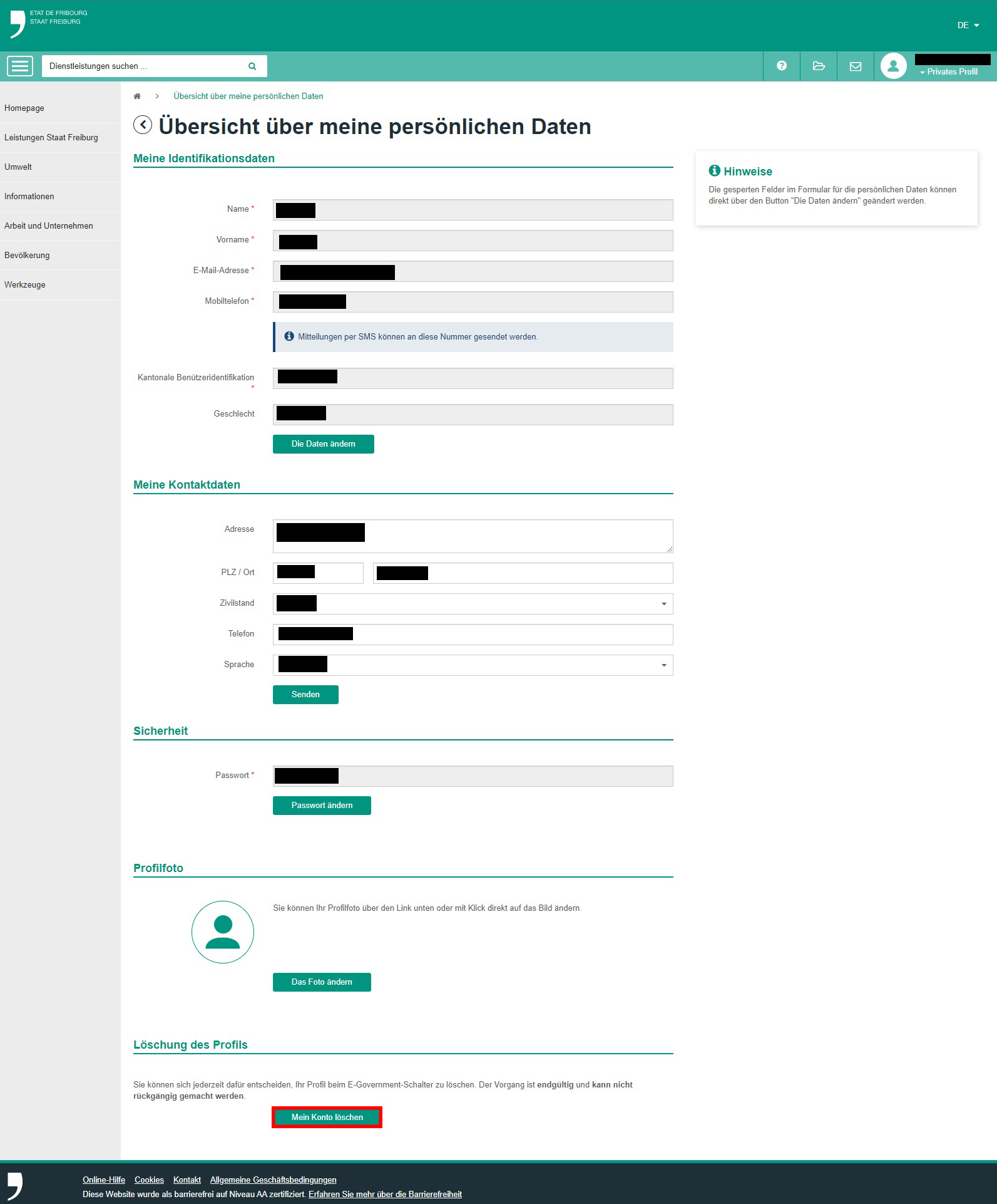 Um den Zugang zu FRIAC zu löschen, müssen Sie sich in den virtuellen Schalter (eGov) begeben. Sobald Sie sich mit Ihrer SwissID eingeloggt haben, müssen Sie auf Übersicht über meine persönlichen Daten und dann auf die Schaltfläche Mein Konto löschen klicken.
