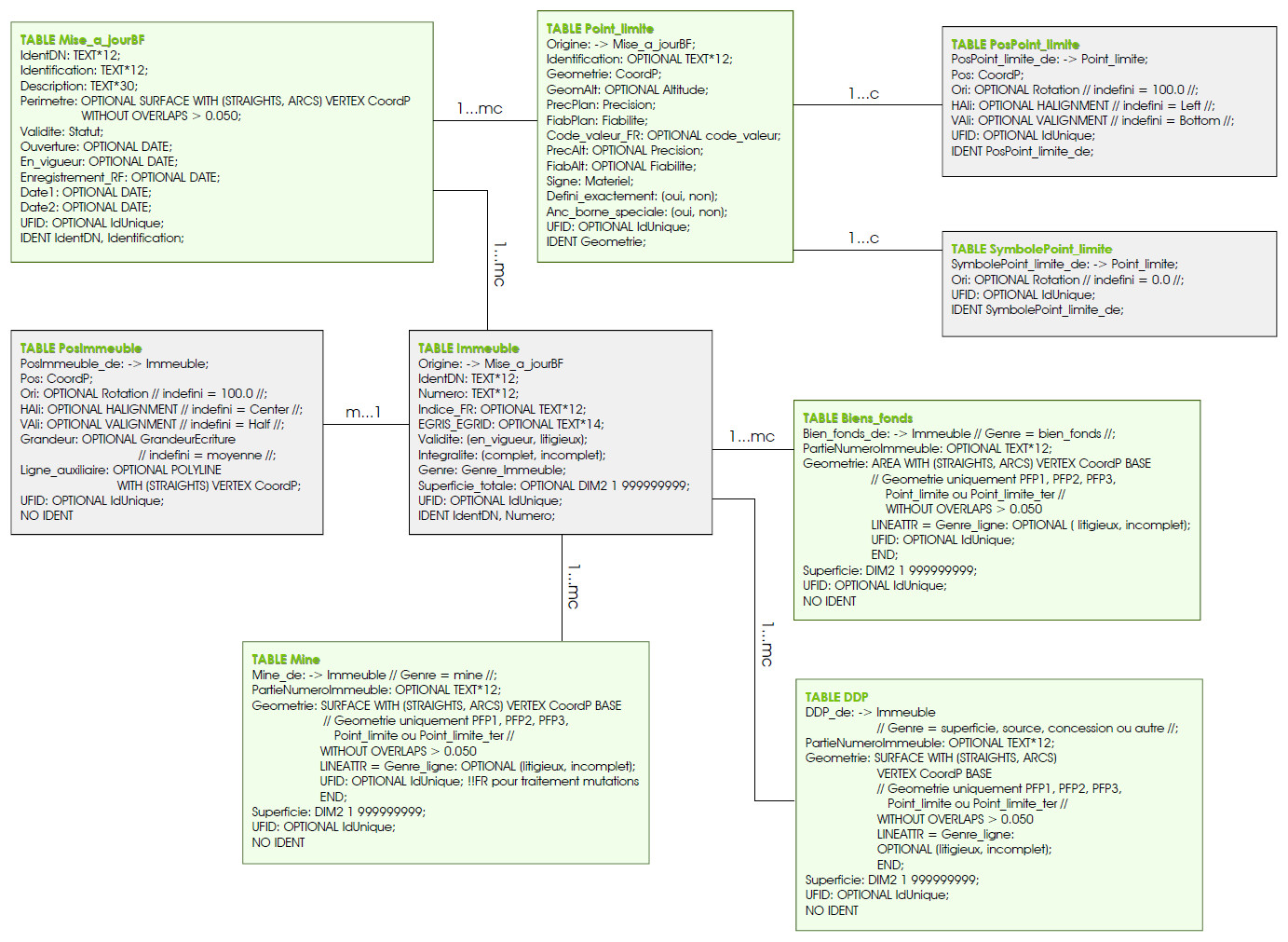 Das Datenmodell «MD01MOMN95FR24D» (DM.01-AV-FR) wurde in «INTERLIS», Version 1 geschrieben. Es beruht auf dem Modell des Bundes «MD01MOMN95CH24D», dem kantonale Informationen in Form von zusätzlichen «ATTRIBUTEN» oder «TABLE» beigefügt wurden. Der Kanton selber verwendet ausschliesslich das französischsprachige Datenmodell «MD01MOMN95FR24F», er stellt jedoch gratis einen Transformationsdienst der Firma Infogrips zur Verfügung. Der Bezugsrahmen für die Ämter des Kantons Freiburg ist LV95.