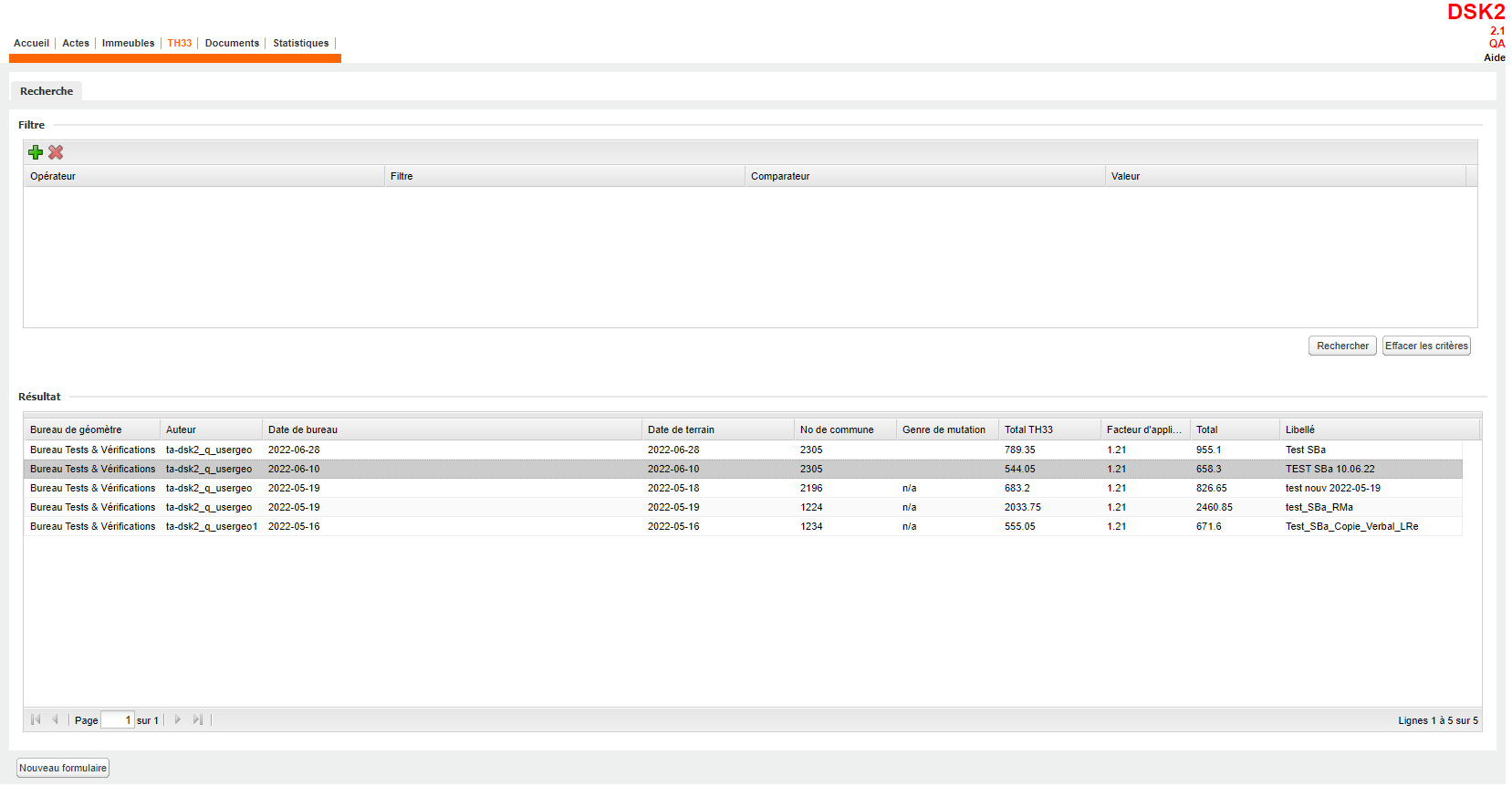 In der ersten Hälfte des Fensters können Sie einen Filter eingeben, um die Suche einzugrenzen. Ein Filter nach einer Gemeinde zeigt beispielsweise nur die HO33-Formulare an, die mit dieser Gemeinde in Verbindung stehen. Ohne Filter werden bei der Suche alle HO33-Formulare, die von der Behörde erstellt wurden, zurückgegeben. Beachten Sie, dass die HO33, solange sie nicht mit einer Akt verknüpft sind, nur für das jeweilige Büro sichtbar sind. Es ist also möglich, Angebote oder HO33-Versionen von büro internen Arbeiten auszufüllen.