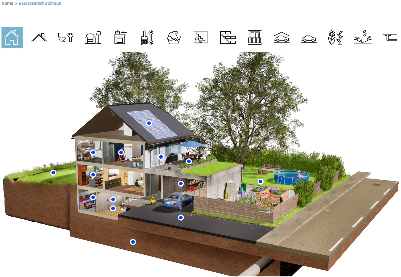 Auf der Website wasser-wissen.ch zeigt ein interaktives Haus, wie man bei der Hausarbeit, der Instandhaltung, dem Bau oder der Renovierung eines Hauses dazu beitragen kann, das Wasser sauber zu halten.