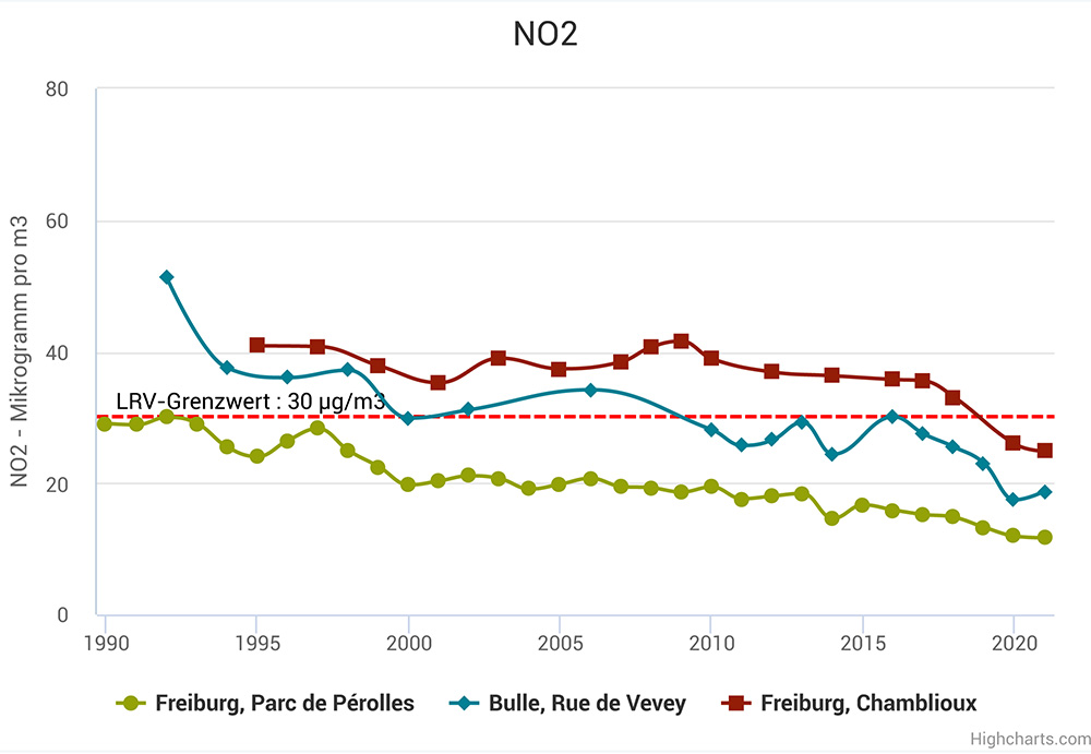 - Messstationen (Freiburg, Pérolles-Park; Bulle, Rue de Vevey; Freiburg, Chamblioux);