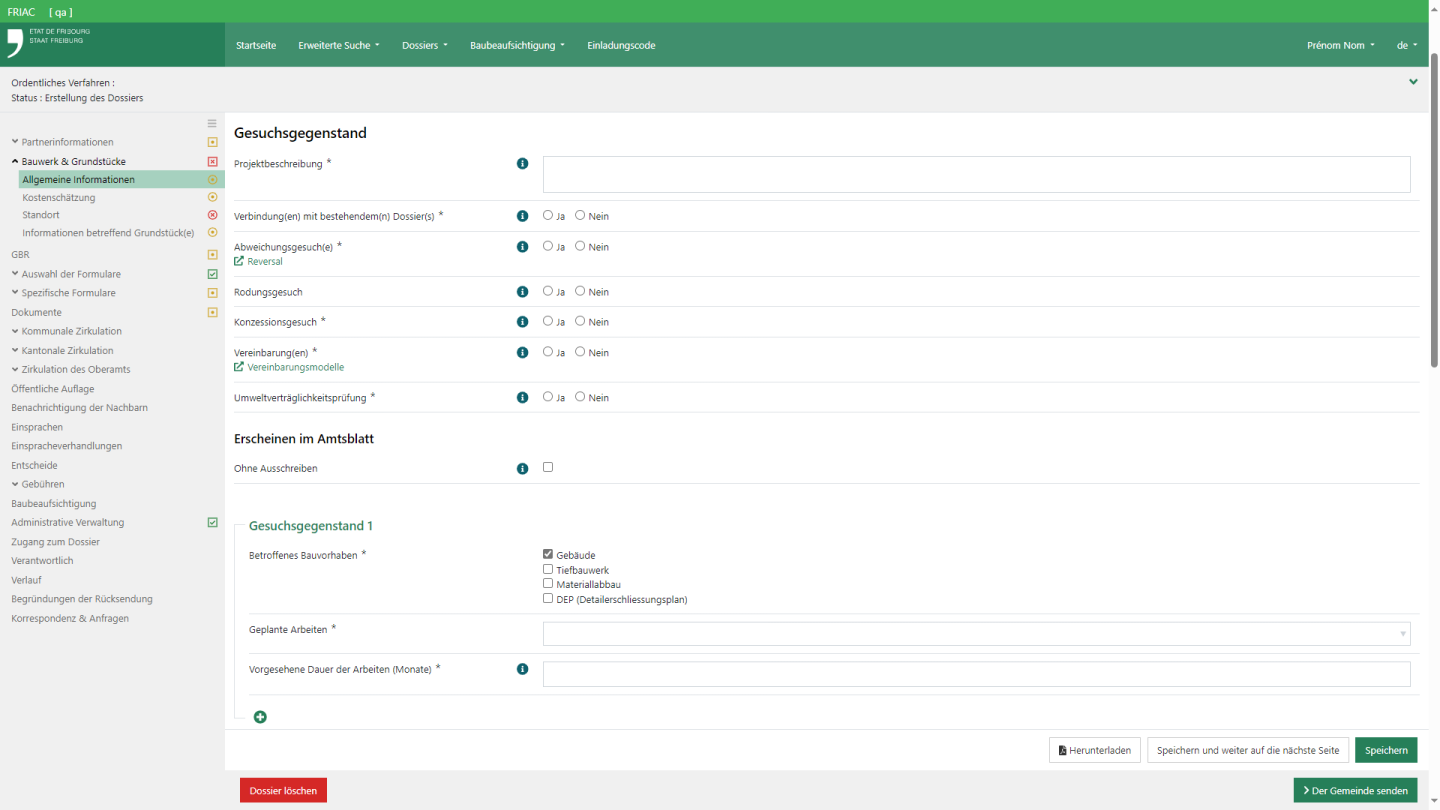 - Ein Modul, das es Gemeinden ermöglicht, Projekte im GWR direkt aus FRIAC heraus zu erstellen;