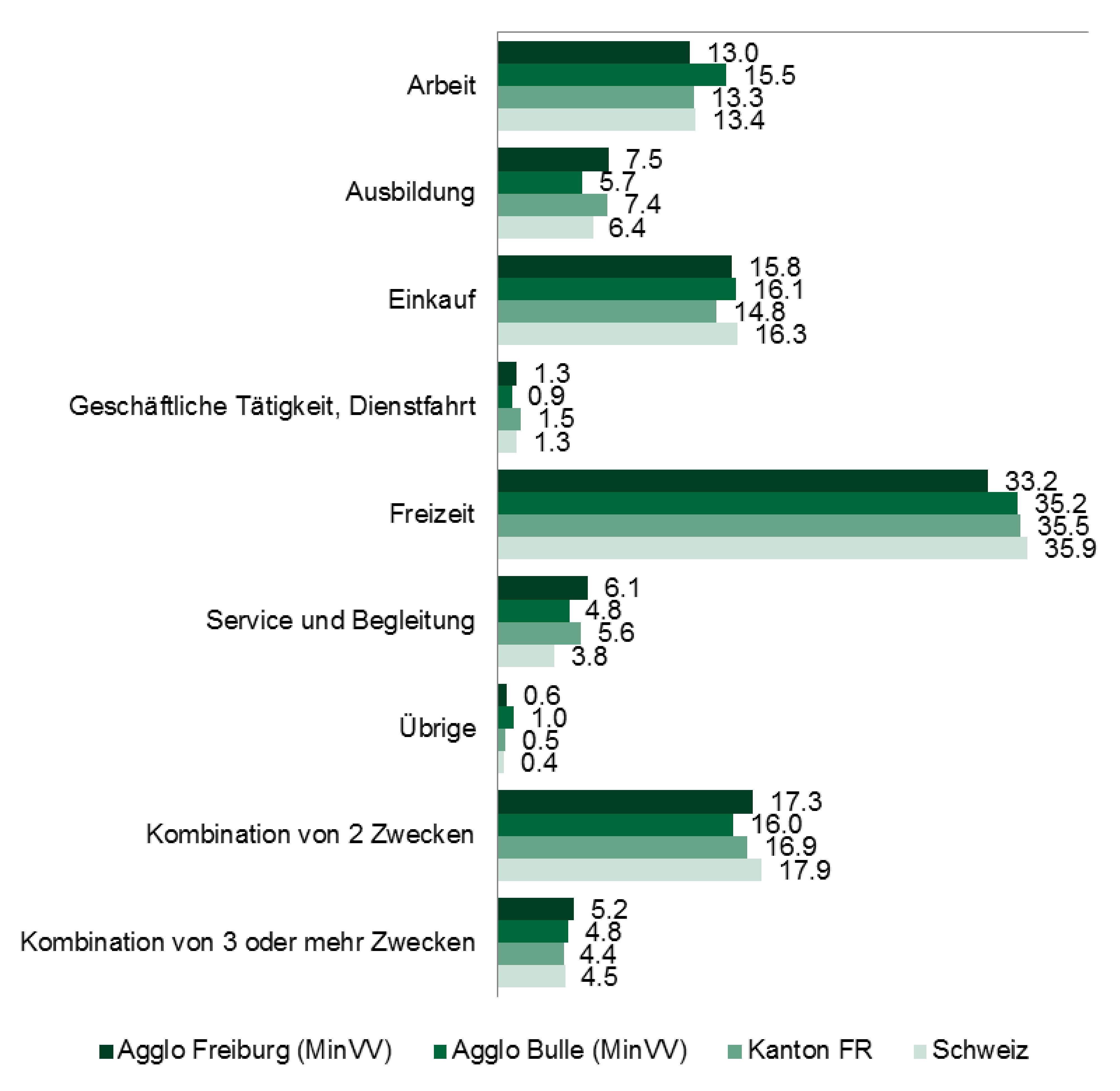 Ausgänge zum reinen Zweck der Freizeit stellen in der Schweiz mit 36% nach wie vor den grössten Anteil dar. Bei 23% der Ausgänge der Schweizer Bevölkerung werden zwei oder mehr Zwecke in Form einer Wegkette kombiniert. Am häufigsten werden im Kanton Freiburg dabei die Zwecke Einkauf und Freizeit kombiniert.