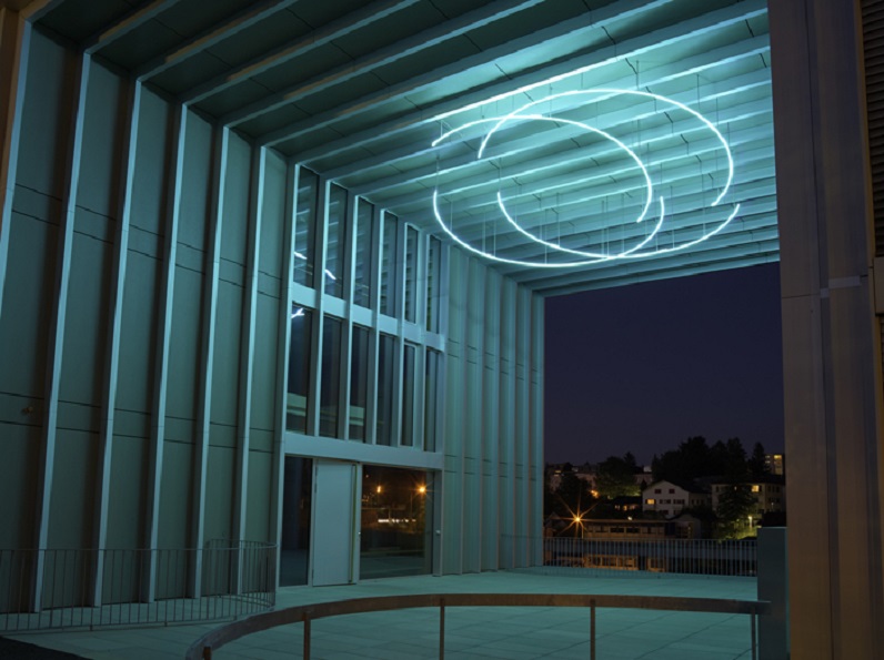 Connivence: So heisst das künstlerische Werk, das nun das Gebäude EVA in Givisiez bereichert. Es ist das Werk des Künstlerduos Barbezat-Villetard, das den Wettbewerb gewann, den der Staatsrat im Rahmen des Projekts zur Renovierung des Gebäudes organisiert hat. Connivence hat die Form einer Lichtskulptur und ist im Zentrum des Eingangsbogens an der Decke befestigt. Das Werk, das heute anlässlich der Vernissage vorgestellt wurde, ist das Resultat des Kulturprozents, der im Gesetz über die kulturellen Angelegenheiten (KAG) vorgesehen ist.