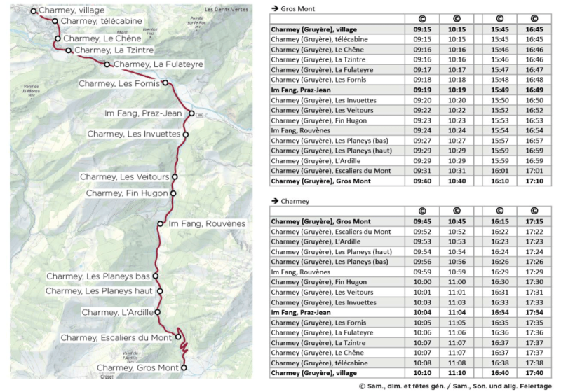Der Kleinbus verkehrt vom 10. September bis zum 30. Oktober zwischen Charmey und dem Parkplatz Haut-duMont. Er fährt jeden Samstag und Sonntag um 9.15 Uhr, 10.15 Uhr, 15.45 Uhr und 16.45 Uhr von der Haltestelle Charmey, village ab. Die Rückfahrten erfolgen ab Haut-du-Mont an denselben Tagen um 9.45 Uhr, 10.45 Uhr, 16.15 Uhr und 17.15 Uhr. Auf der Strecke werden mehrere andere Haltestellen auf Anfrage am Beginn von Wanderwegen bedient, was Möglichkeiten für Routen ins Motélon-Tal und sogar das Intyamon über den Plan de Tissiniva bietet. Auch die Buvette von Les Invuettes wird bedient.