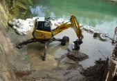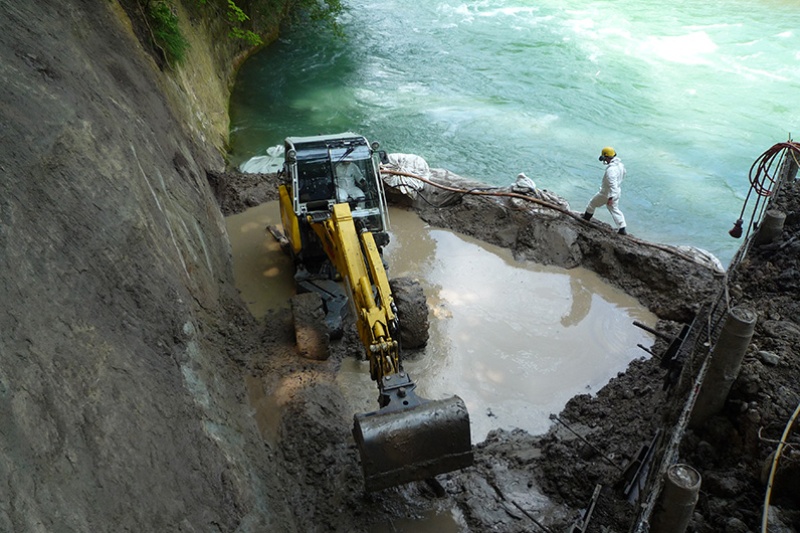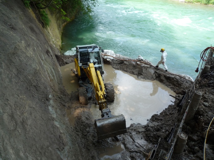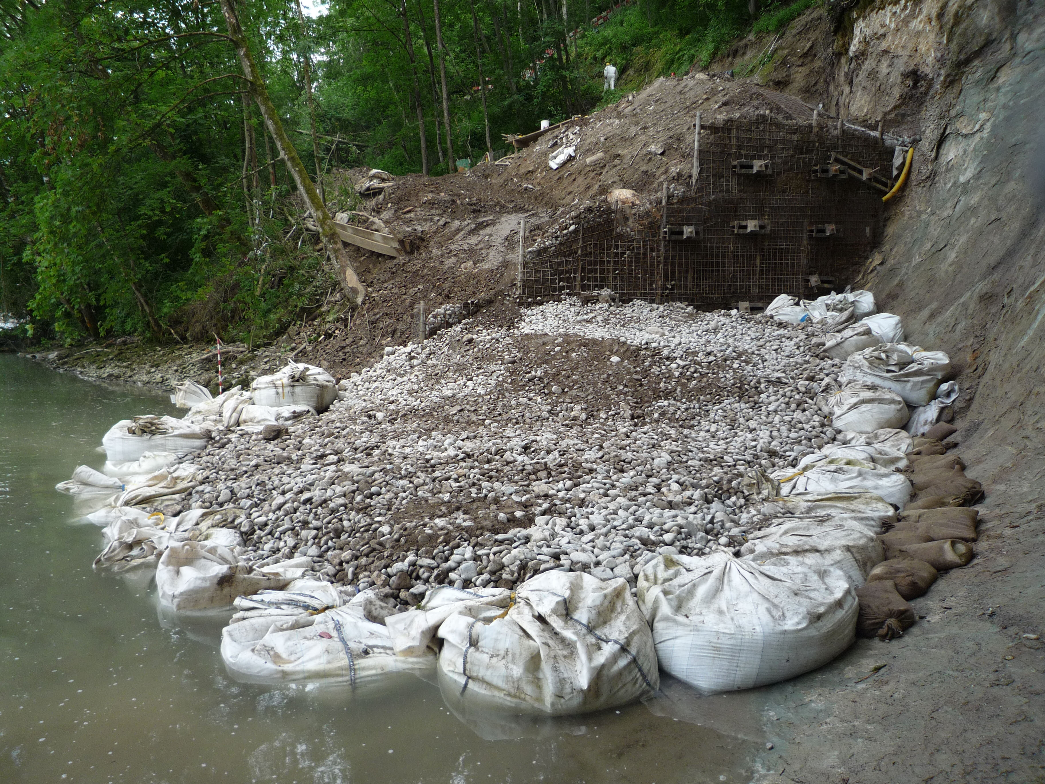 - Bau von zwei Stützwänden mit Bohrpfählen in der Molasse (flussaufwärts, in der Verlängerung des von Tuffstein geprägten Gebiets und an der Südflanke der Deponie)