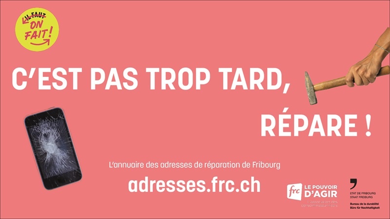 Die zweite Werbekampagne der Fédération romande des consommateurs (FRC) in allen öffentlichen Verkehrsmitteln des Kantons Freiburg wirbt mit dem Slogan «C’est pas trop tard, répare» und erinnert daran, dass Geräte und Gebrauchtgenstände oft nicht weggeworfen werden müssen, sondern repariert werden können. Die Plattform der guten Adressen der FRC, die mit der Unterstützung des Büros für Nachhaltigkeit (BüN) des Staats Freiburg entwickelt wurde, stellt verschiedene Verzeichnisse zur Verfügung (insbesondere zu den Themen Reparatur, Wiederverwendung und Offenverkauf), die sich an alle richten. Die Adressen werden dank der Arbeit von Freiwilligen und der Zusammenarbeit mit dem BüN regelmässig ergänzt und aktualisiert.