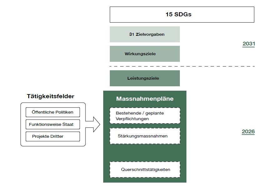 Nachhaltige Entwicklung impliziert eine langfristige Perspektive. Um die Kohärenz mit der Agenda 2030 zu gewährleisten und die Strategie auf die aktuellen Gesetzgebungen auszurichten, wurde als Zeithorizont das Jahr 2031 (Ende der Legislaturperiode, die 2027 beginnt) gewählt.