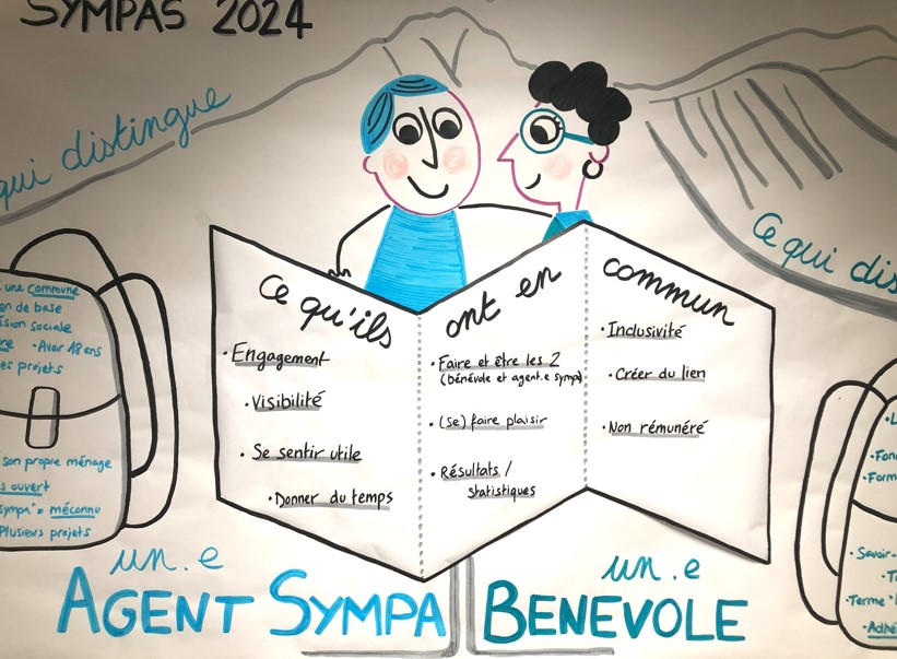 Zum Einstieg der Tagung gab Bénévolat Fribourg-Freiburg Einblick in ihre Tätigkeit und umriss die Eckpfeiler der Freiwilligenarbeit. Im Anschluss daran stand der Austausch zwischen den Teilnehmenden im Zentrum. France Hammel vom «Atelier des Kips» illustrierte diesen mit Text und Bild in Echtzeit.