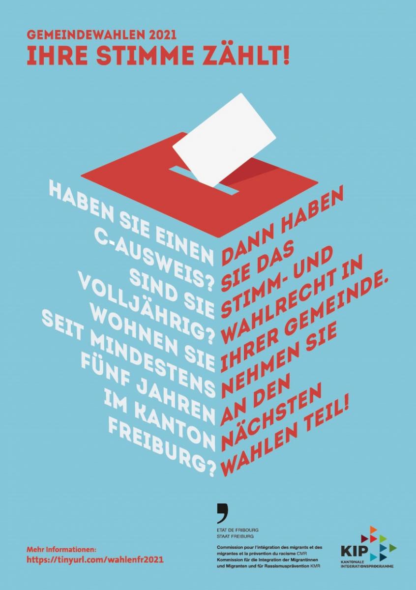 «Haben Sie einen Ausweis C? Sind Sie volljährig? Wohnen Sie seit mindestens fünf Jahren im Kanton Freiburg? Dann sind Sie in Ihrer Gemeinde stimm- und wahlberechtigt. Nehmen Sie an den nächsten Wahlen teil! Ihre Stimme ist wichtig für die Demokratie!» So lautet die Botschaft an die betroffenen Freiburgerinnen und Freiburger, die in den sozialen Medien und mit Plakaten und Flyern, welche die Gemeinden und die im Migrationsbereich tätigen Vereine verteilen, verbreitet wird.