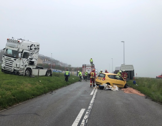 Am Donnerstag, 14. Mai 2020, kurz nach 8:30 Uhr, fuhr ein 21-jähriger Mann mit einem Lastwagen auf der Route des Barattes in Crêt-près-Semsales, von Bulle in Richtung Oron. An der Kreuzung mit der Rue de l’Eglise verweigerte ihm eine Autofahrerin, die aus einer noch unbekannten Richtung her kam, den Vortritt. Trotz eines Ausweichversuchs traf der Lastwagen das Auto, welches zirka 15 Meter weggeschleudert wurde, bevor es auf der Fahrspur Oron-Bulle zum Stillstand kam. Augenblicke später wurde das Auto von einem zweiten Fahrzeug angefahren, das an einen Pferdeanhänger gekoppelt war und von einem 70-jährigen Mann gelenkt wurde, der von Oron in Richtung Bulle unterwegs war. Die beiden verletzten Insassinnen des Autos, eine 25-jährige Frau und ihre 2-jährige Tochter wurden von einem Krankenwagen ins Spital gebracht. Eine Untersuchung ist im Gange, um die genauen Umstände dieses Unfalls zu ermitteln. Zu Interventionszwecken wurde die Strasse für 3 ¼ Stunden gesperrt. Die Feuerwehr des Stützpunktes Chatel-St-Denis wurde hinzugezogen, um den auf die Fahrbahn ausgelaufenen Treibstoff zu neutralisieren.