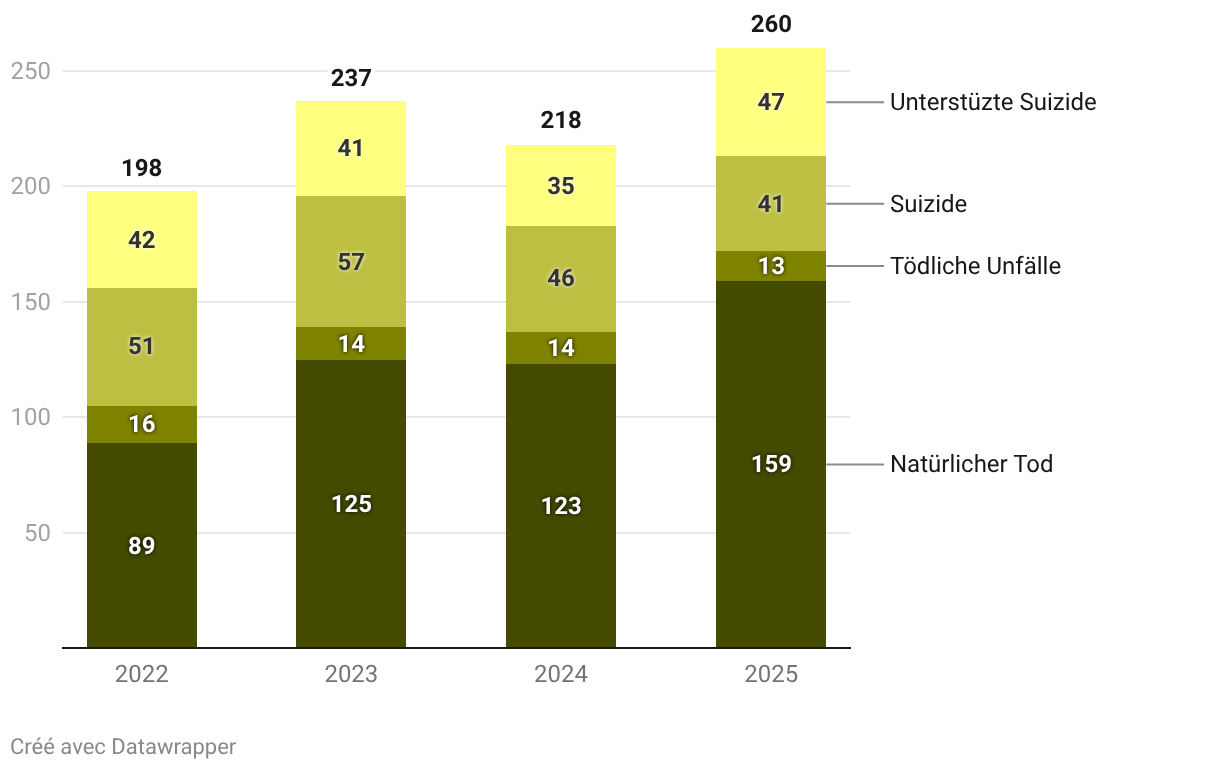 2022 2023 2024 2025 Entwicklung Total 69 98 81 88 9 % Männer 39 65 49 47 -4 % Frauen 30 33 32 41 28 % Suizidversuche