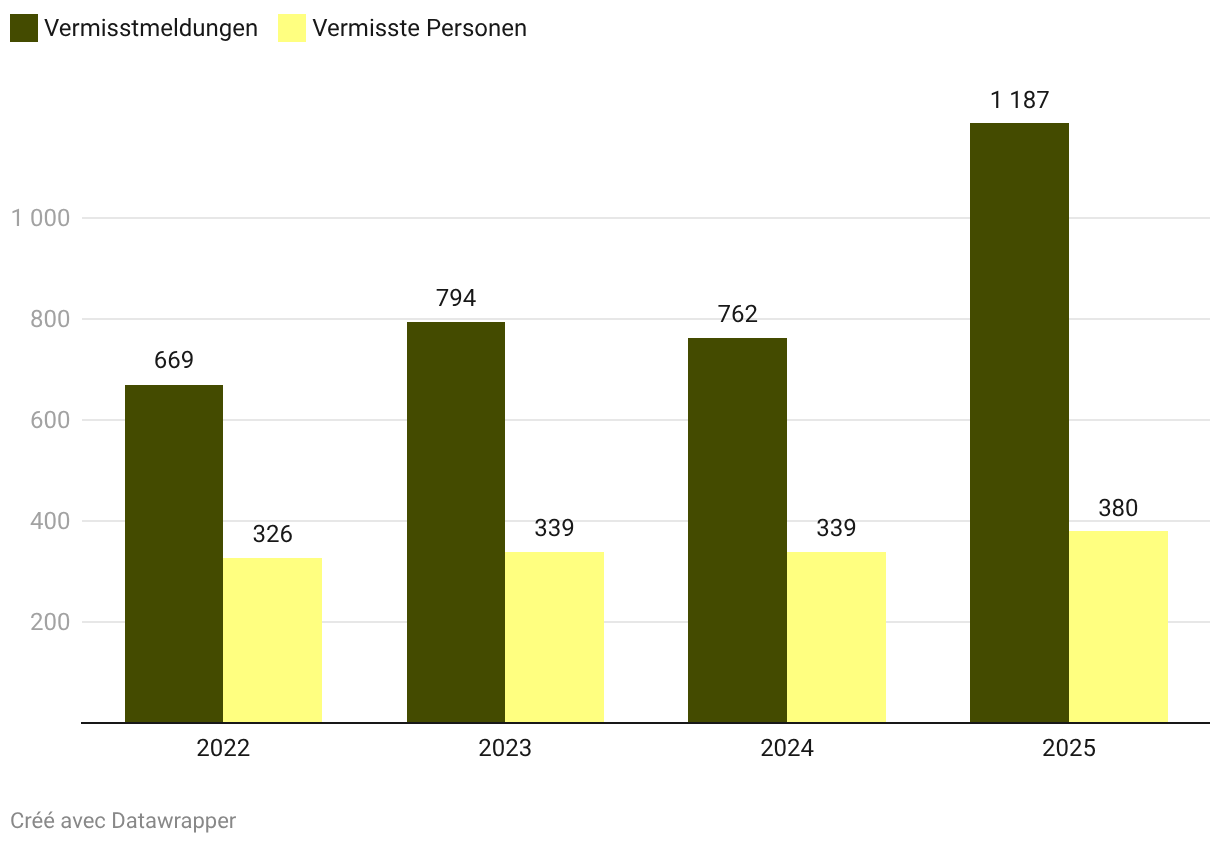 | Vermisstmeldungen | 669 | 794 | 762 | 1'187 | 56 % |