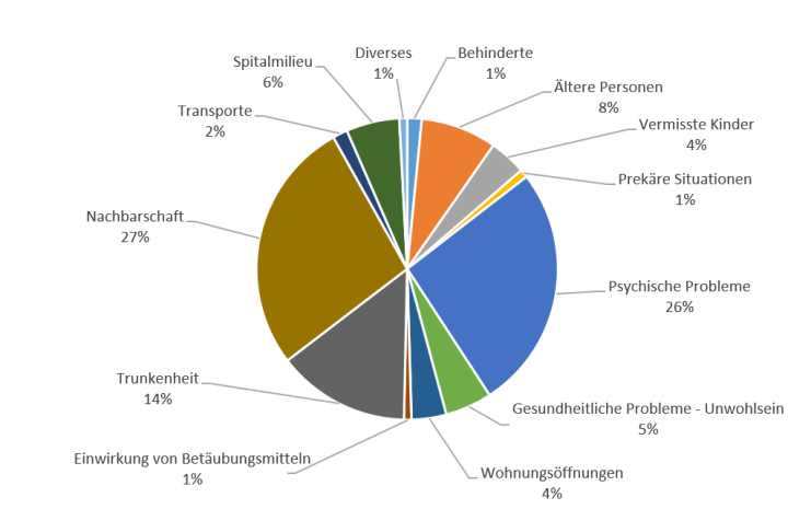 2019 2020 2021 2022 Entwicklung Total 6'851 7'093 7'807 8'220 5 % davon Suizide inklusive Versuche 165 140 117 175 50 % Häusliche Gewalt 547 576 512 586 14 % Personen in Schwierigkeiten 1'958 2'245 2'375 2'628 11 % Vermisstmeldungen 807 641 812 669 -18 % -