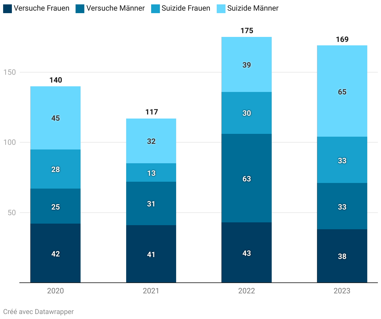 2020 2021 2022 2023 Entwicklung Total 73 45 69 98 42 % Männer 45 32 39 65 67 % Frauen 28 13 30 33 10 % Suizidversuche
