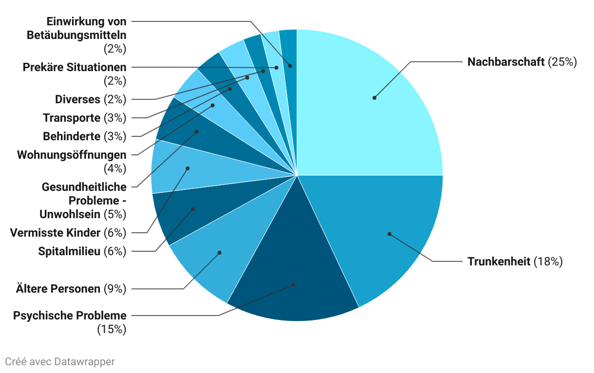 2020 2021 2022 2023 Entwicklung Total 7'093 7'807 8'220 7'973 -3 % davon Suizide inklusive Versuche 140 117 175 169 -3 % Häusliche Gewalt 576 512 586 577 -2 % Personen in Schwierigkeiten 2'245 2'375 2'628 2'112 -20 % Vermisstmeldungen 641 812 669 794 19 % -