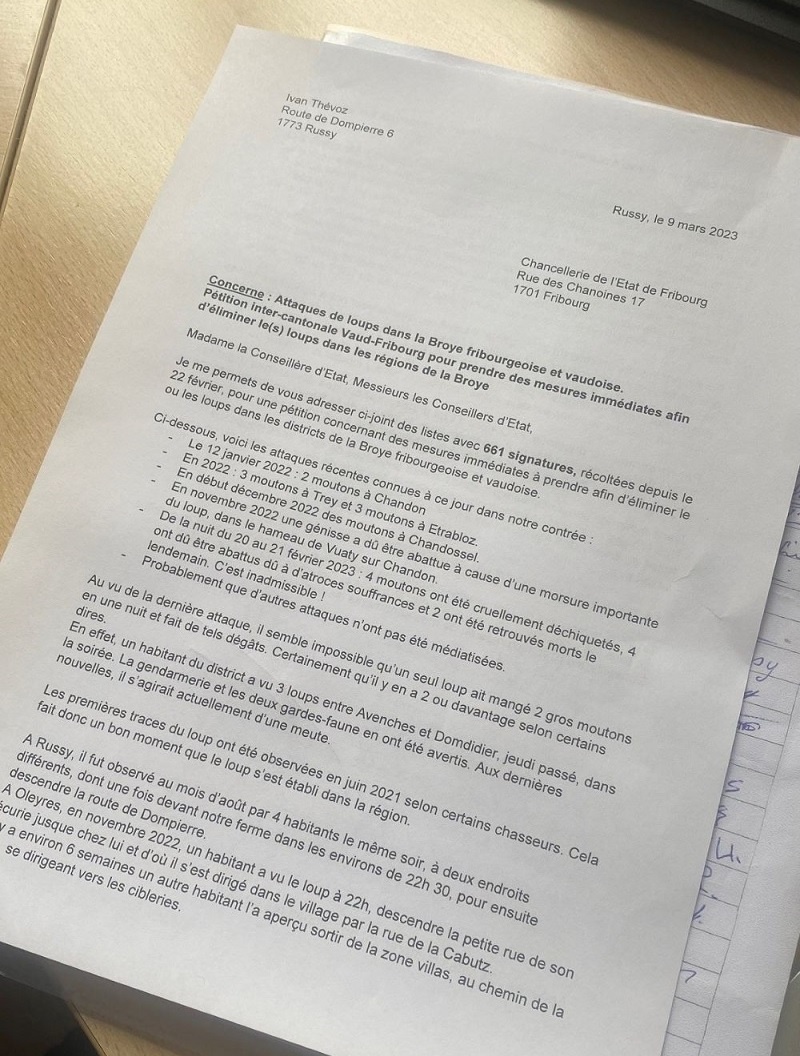 Heute Vormittag wurde bei der Staatskanzlei eine Petition eingereicht, mit der gefordert wird, dass «sofort Massnahmen ergriffen werden, um den Wolf oder die Wölfe in den Regionen Avenches und Chandon zu eliminieren», und die mit 661 Unterschriften versehen ist.