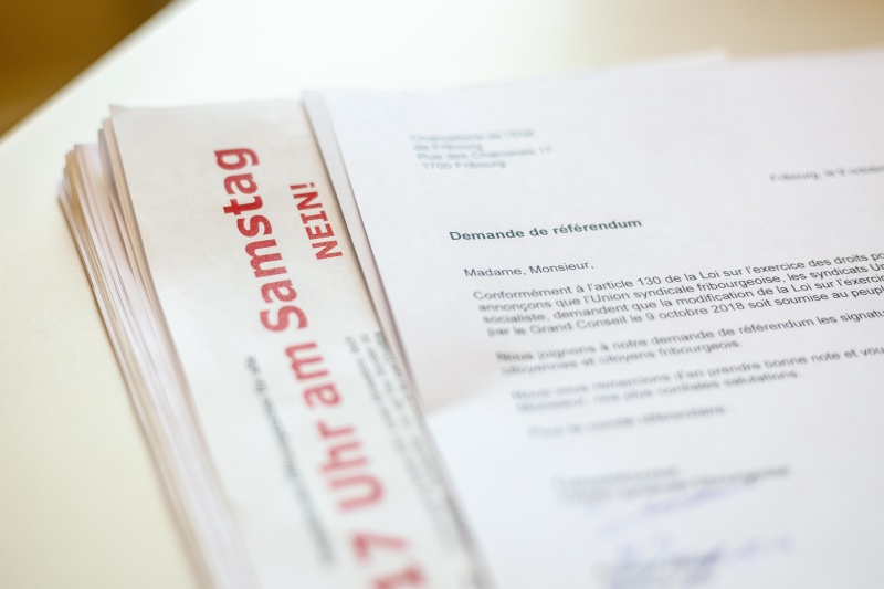 Die Staatskanzlei bestätigt, dass sie heute Vormittag die Ankündigung eines Referendumsbegehrens erhalten hat. Es kommt vom Freiburgischen Gewerkschaftsbund (FGB), und damit wird verlangt, dass das Gesetz vom 9. Oktober 2018 zur Änderung des Gesetzes über die Ausübung des Handels (Ladenöffnungszeiten am Samstag) dem Volk zur Abstimmung unterbreitet wird.
