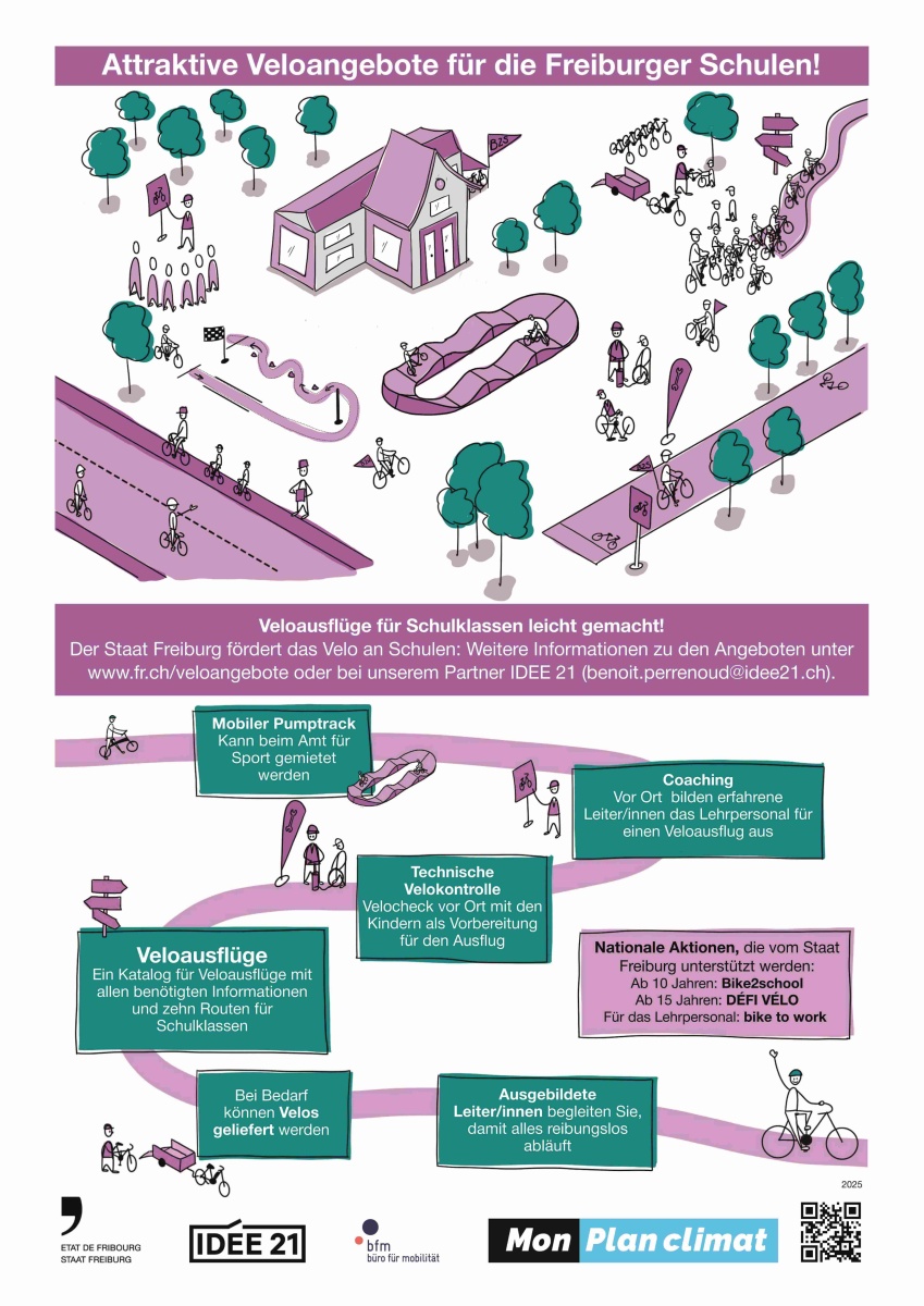 Um die sanfte Mobilität zu fördern, vereint diese Seite die verschiedenen Angebote und Projekte im Kanton Freiburg, die sich insbesondere an die Schulen und ihre Schülerinnen und Schüler richten. Sie können die Angebote frei wählen und kombinieren :