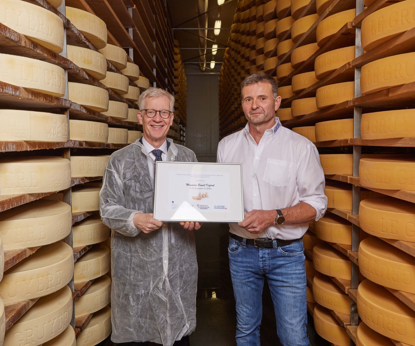 Im Namen des Staatsrats übergab Präsident Jean-Pierre Siggen diese Woche die beiden Auszeichnungen für den besten Greyerzer AOP und den besten Freiburger Vacherin AOP des Jahres 2024 aus dem Kanton Freiburg. Sie gingen an den Gruyère AOP, der von Benoît Deforel in der Käserei Sâles hergestellt wird, und an den Freiburger Vacherin AOP, der von Stéphane Schneuwly in der Käserei Arconciel hergestellt wird. Die beiden Käser haben das Recht, zu erwähnen, dass ihre Produkte vom Staatsrat während eines Jahres für seine Empfänge ausgewählt wurden.