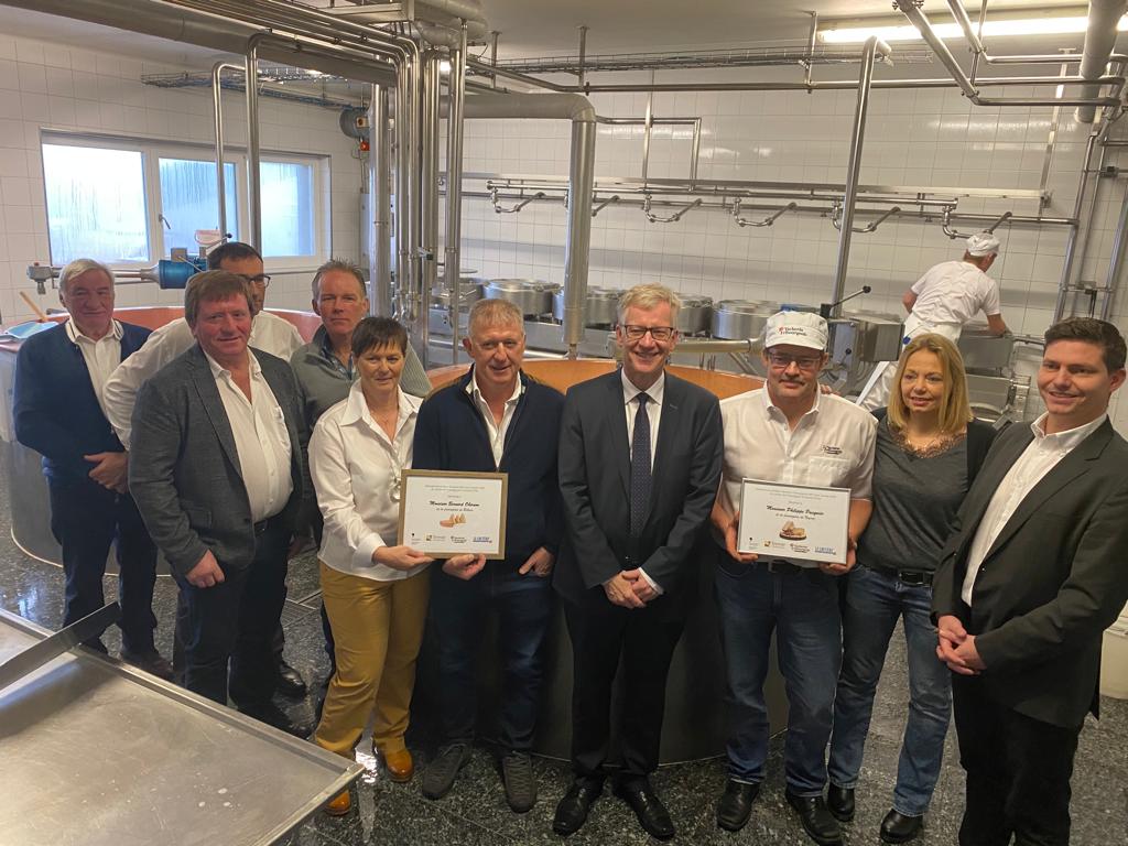 Im Namen des Staatsrats übergab der Präsident Jean-Pierre Siggen heute Morgen in Neyruz die ersten beiden Auszeichnungen für den besten Gruyère AOP und den besten Vacherin Fribourgeois AOP des Jahres 2020 aus dem Kanton Freiburg. Sie wurden dem Gruyère AOP, der von Bernard Oberson in der Käserei Billens hergestellt wird, und dem Vacherin Fribourgeois AOP, der von Philippe Pasquier in der Käserei Neyruz produziert wird, verliehen. Die beiden Käser haben das Recht, zu erwähnen, dass ihre Produkte vom Staatsrat während eines Jahres für seine Empfänge ausgewählt wurden. «Der Staatsrat hat das Gesuch der Branchenorganisation des Gruyère und dasjenige der Branchenorganisation des Vacherin Fribourgeois positiv beantwortet, weil er sehr empfänglich für die Produkte der Region ist, deren Qualität von ausgewählten Rohmaterialien und dem Know-how, das von Generation zu Generation weitergegeben wird, abhängt», unterstrich Jean-Pierre Siggen.