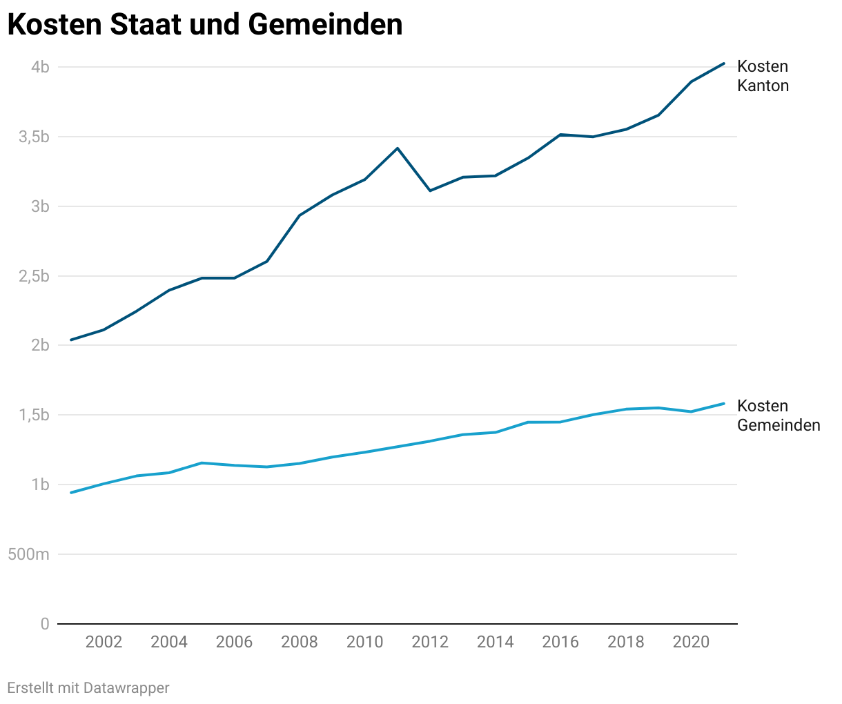 In den letzten 20 Jahren haben sich die Kosten des Staates von 2,04 Milliarden auf 4,02 Milliarden Franken verdoppelt, während die Kosten der Gemeinden um 66 % (von 0,94 Milliarden auf 1,58 Milliarden) gestiegen sind.