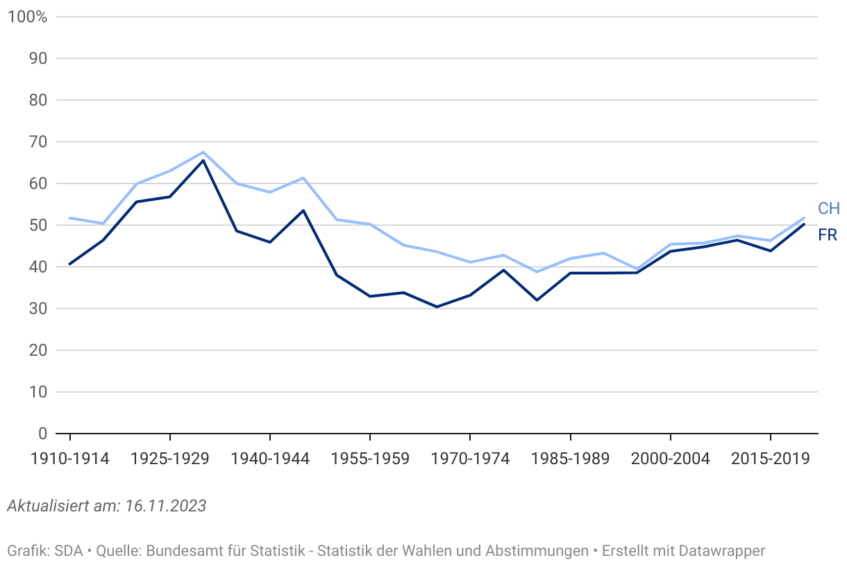 Stimmbeteiligung an eidgenössischen Abstimmungen von 1910 bis 2023