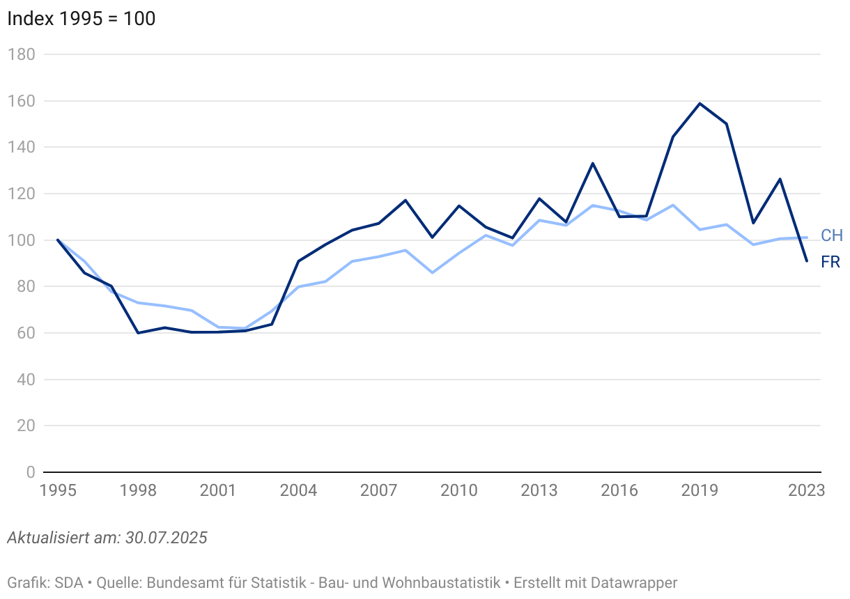 Im Jahr 2023 wurden im Kanton Freiburg 1803 und in der Schweiz 46'731 Neubauwohnungen erstellt. Im Jahr 2023 liegt der Wohnungsproduktionsindex des Kantons Freiburg über 10 Punkte unter demjenigen der Schweiz. Eine vergleichbare Situation gab es zuletzt Ende der 1990er-Jahre. Von 2006 bis 2022 verzeichnete die Wohnungsproduktion im Kanton Freiburg ein starkes Wachstum (durchschnittlich 2350 neue Einheiten). Zum ersten Mal ging sie jedoch im Jahr 2023 zurück und erreichte damit das gleiche Niveau wie im Jahr 2004.