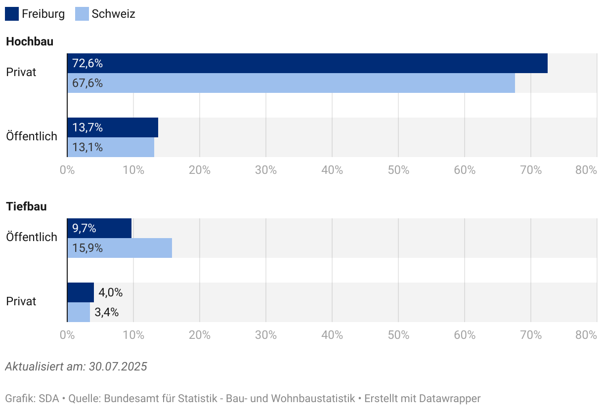 Im Jahr 2023 betrugen die im Kanton Freiburg getätigten Bauinvestitionen 2131 Millionen Franken, was einer Zunahme um 2,2 % gegenüber 2022 (2085 Mio.) entspricht. Im gleichen Zeitraum nahmen die Bauinvestitionen landesweit um 1,4 % zu, und zwar von 60'875 Millionen im Jahr 2022 auf 61'745 Millionen im Jahr 2023.Im Jahr 2023 wurden im Kanton Freiburg 72,6 % der Bauinvestitionen von privaten Bauherren für den Bau von Gebäuden getätigt, während ihr Anteil landesweit bei 67,6% lag. Beim Tiefbau belief sich der Anteil der Investitionen der öffentlichen Auftraggeber in der Schweiz auf 15,9% und im Kanton Freiburg auf 9,7%.