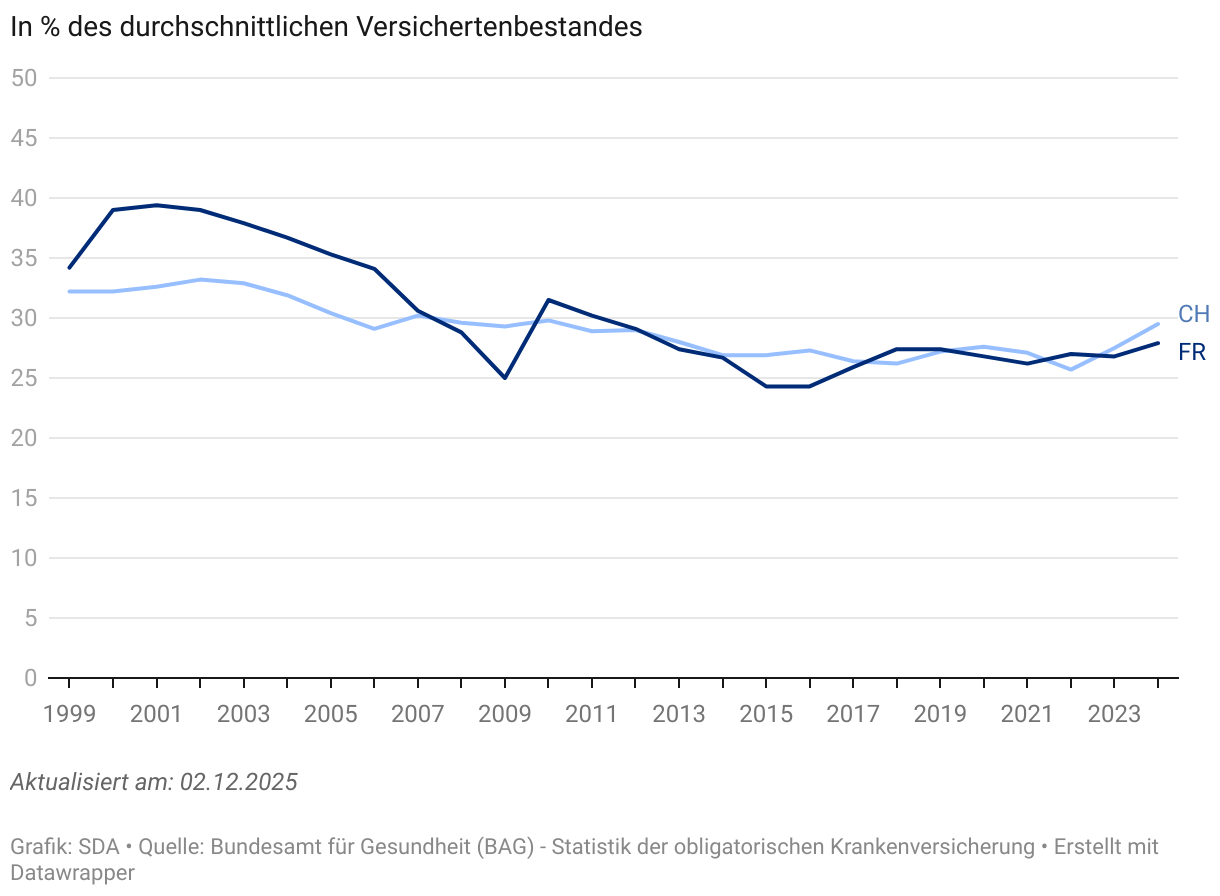 2023 betrug die mittlere jährliche Prämie pro versicherte Person in der Grundversicherung 3710 Franken im Kanton Freiburg, gegenüber 3963 Franken auf Schweizer Ebene. Für eine erwachsene Person (26 Jahre und älter) belief sie sich auf 4493 Franken (Schweiz: 4708 Franken). Nach mehreren Jahren moderaterer Entwicklung stiegen die Prämien deutlich an, mit durchschnittlich +6,2% im Kanton Freiburg und +5,2% auf nationaler Ebene. Dieser Trend setzte sich 2024 fort. Laut Schätzungen des BAG stieg die mittlere Prämie pro Versicherten im Kanton Freiburg um 8,3% (Schweiz: 8,1%). Für 2025 wird mit einem Anstieg von 6,9% im Kanton gerechnet (Schweiz: 6,0%).