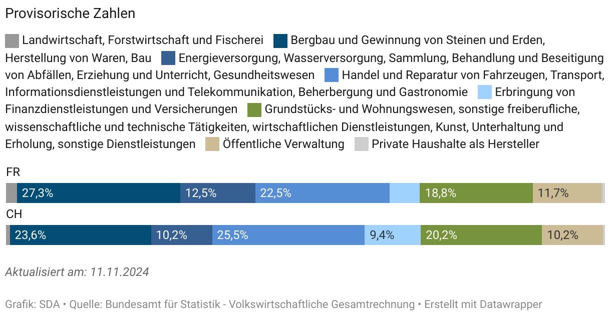 Der Industriesektor trägt im Kanton Freiburg im Vergleich zur Schweiz überdurchschnittlich zur Wertschöpfung bei. Die verarbeitende Industrie und der Bausektor machten im Jahr 2022 27,3% der Gesamtwertschöpfung im Kanton Freiburg aus. In der Schweiz beträgt dieser Wert nur 23,6%. Ferner hat der Primärsektor (Landwirtschaft, Forstwirtschaft und Fischerei) im Kanton Freiburg eine deutlich höhere Bedeutung als in der gesamten Schweiz. Er trägt mit 1,8% zur Wertschöpfung bei, während er auf Landesebene nur 0,6% der Gesamtwertschöpfung ausmacht. Ebenso tragen die Branchen Elektrizitäts-, Gas-, Dampf- und Klimaanlagenversorgung, Wasserversorgung, Abwasser- und Abfallentsorgung, Bildung, Gesundheitswesen und der öffentliche Dienst jeweils zu 12,5% bzw. 11,7% zur Wertschöpfung bei, leicht höhere Prozentsätze als der nationale Durchschnitt von jeweils 10,2%.
