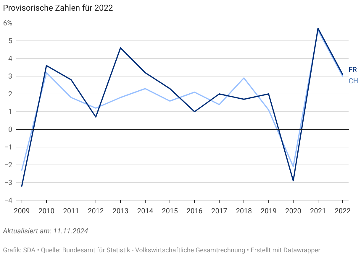 Im Jahr 2022 belief sich das BIP des Kantons Freiburg auf 21’424 Mio. Franken, was 2,7% des BIP der Schweiz entspricht. Das nominale Bruttoinlandprodukt (BIP), das nicht preisbereinigt ist, verzeichnete im Jahr 2022 im Vergleich zum Vorjahr einen Anstieg um 5,7% und setzte damit seine Erholung nach der COVID-19-Pandemie fort. Das reale BIP, das preisbereinigt ist und in Preisen des Vorjahres ausgedrückt wird, wuchs ebenfalls um 3,1%.