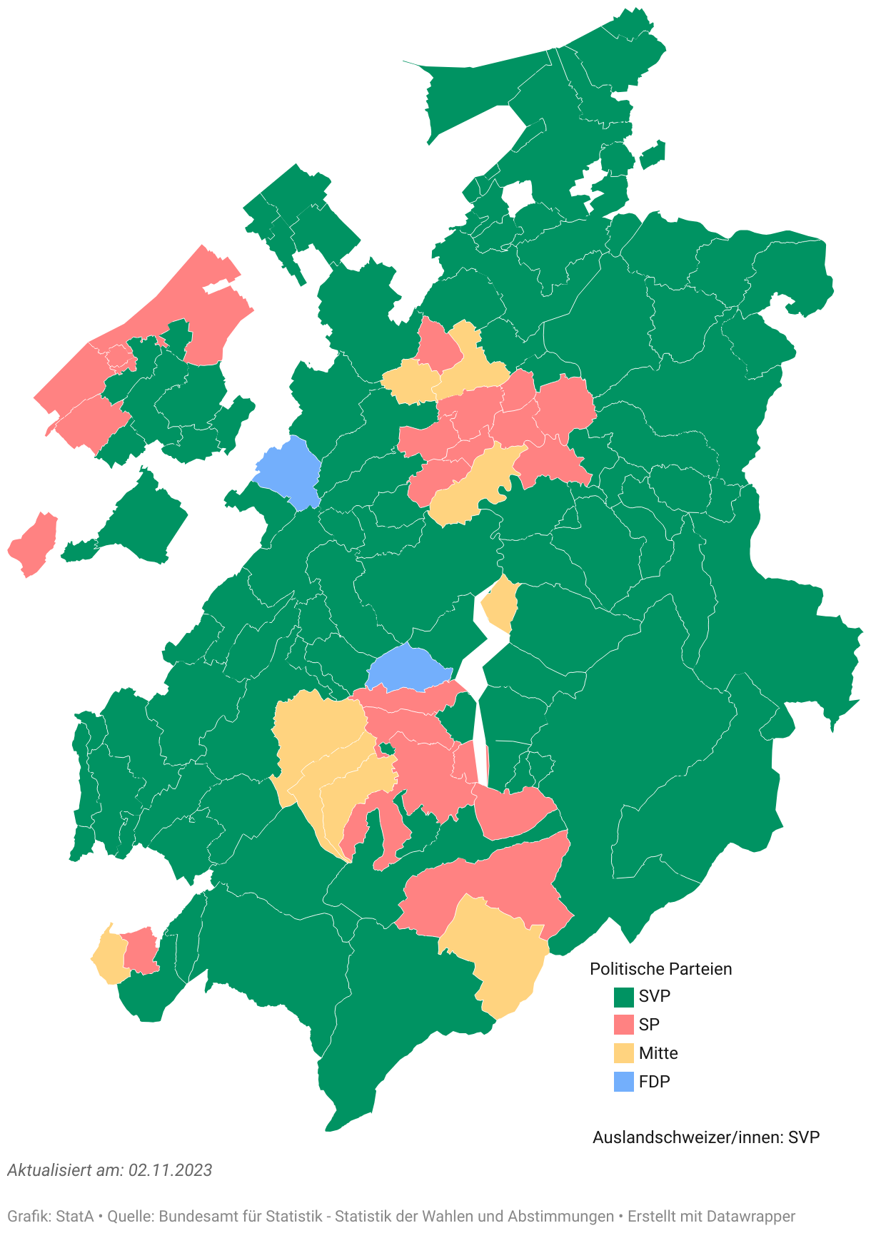 Bei den letzten Wahlen 2023 erreichte die Schweizerische Volkspartei SVP mit 25,8 Prozent (+5,6 Prozentpunkte seit 2019) den höchsten Stimmenanteil, gefolgt von der Sozialdemokratischen Partei SP mit 20,6 Prozent. Die Mitte (ehem. CVP) erreichte 19,9 Prozent (+2,1 Prozentpunkte) und bleibt die dritte politische Kraft vor der FDP. Die Liberalen mit 13,3 Prozent (-2,1 Prozentpunkte) und den Grünen mit 11,8 Prozent (-0,6 Prozentpunkte).