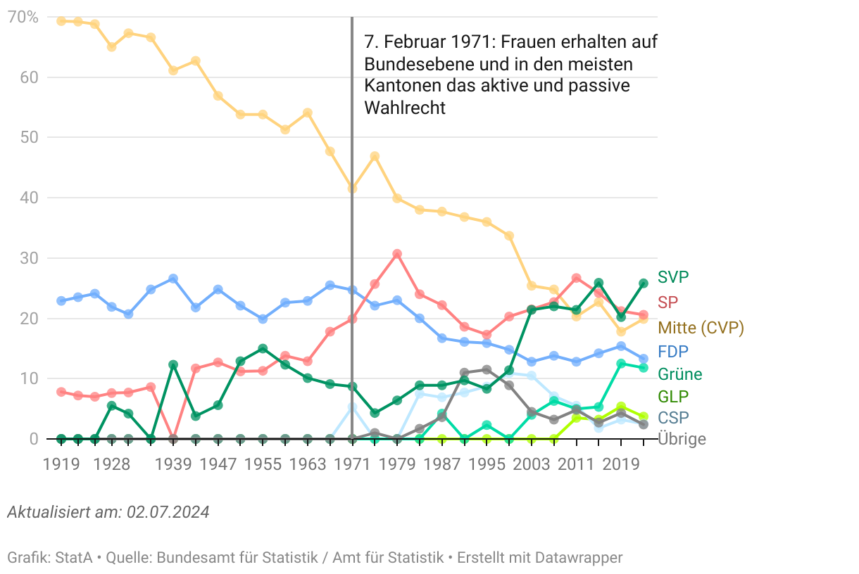 Die Zeitreihe seit 1919 zeigt, dass die CVP bis Ende der 1990er Jahre historisch die stärkste Partei war. Für die SVP, und in geringerem Mass die Grünen, lässt sich seit den 1990er Jahren trotz ständiger Schwankungen nach oben und nach unten ein ansteigender Trend feststellen.