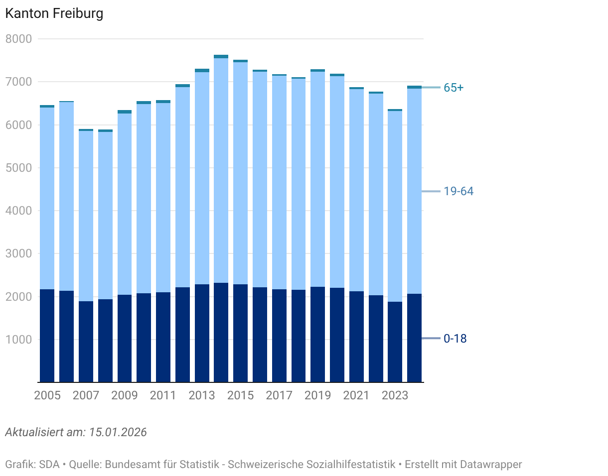 Im Jahr 2024 registrierte der Kanton Freiburg 6905 Sozialhilfebezügerinnen und ‑bezüger. Das sind 8,4% mehr als im Vorjahr (6370 Personen im Jahr 2023). 54,9% dieser Personen sind ausländischer Staatsangehörigkeit. Dieser Anteil liegt über dem Landesdurchschnitt von 52,1%. In der Gruppe der Sozialhilfebezügerinnen und ‑bezüger unter 18 Jahren befinden sich 2060 Personen. Das entspricht knapp einem Drittel (29,8%) aller Sozialhilfebezügerinnen und -bezüger im Jahr 2024. Dieser Anteil ist seit Beginn der Datenreihe leicht gesunken (33,3% im Jahr 2005), im Gegensatz zum Anteil der 56- bis 64-Jährigen, der von 5,5% im Jahr 2005 auf 12,3% im Jahr 2024 gestiegen ist.