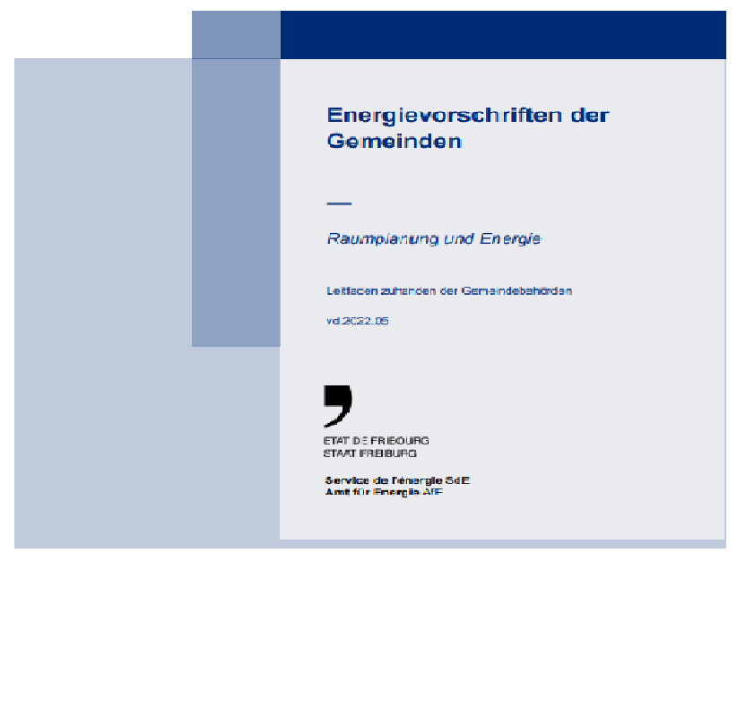 Das Amt für Energie hat den Leitfaden zuhanden der Freiburger Gemeindebehörden «Energievorschriften der Gemeinden. – Raumplanung und Energie» aktualisiert, der vor einigen Jahren in Zusammenarbeit mit dem Energiestadtverein ausgearbeitet wurde. Der Leitfaden bezweckt, den Verantwortlichen der Gemeinden mögliche Energievorschriften vorzustellen, die in die Ortsplanungsinstrumente aufgenommen werden können, sowie einige Ratschläge und Beispiele zu geben.