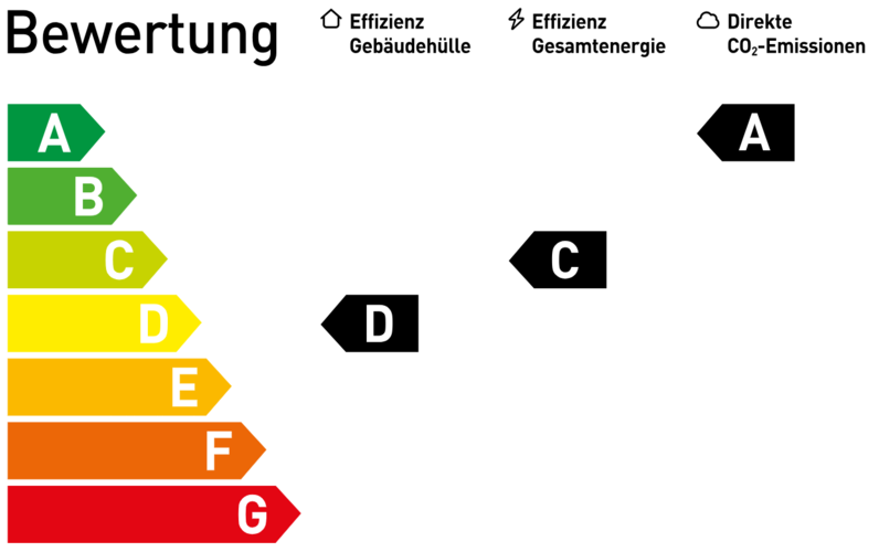 - Die Gesamtenergieeffizienz umfasst den Heizwärmebedarf und die gesamte Gebäudetechnik. Der Einsatz von erneuerbaren Energien oder einer Wärmepumpe führt zu einer besseren Bewertung.