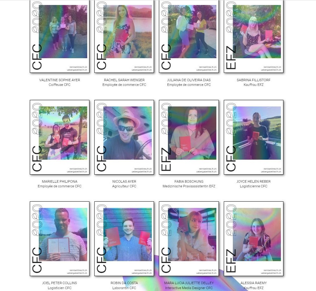 Die Volkswirtschaftsdirektion (VWD) und das Amt für Berufsbildung (BBA) haben ebenfalls keine Mühen gescheut, den Lernenden eine Feier zur Übergabe der Titel zu bieten, die ihrem Erfolg gerecht wird. Zu diesem Zweck ging die Website uebergabetitel.fr.ch am Freitag, 10. Juli 2020, dem ursprünglich offiziellen Tag der Feierlichkeiten, in Form eines digitalen Yearbooks online. Auf dieser Plattform können die erfolgreichen Lehrabgänger bis zu 4 Fotos, allein oder in Begleitung, hochladen. Auch die offizielle Rede sowie der traditionelle musikalische Teil sind, in einer angepassten Form, auf dieser Seite veröffentlicht.