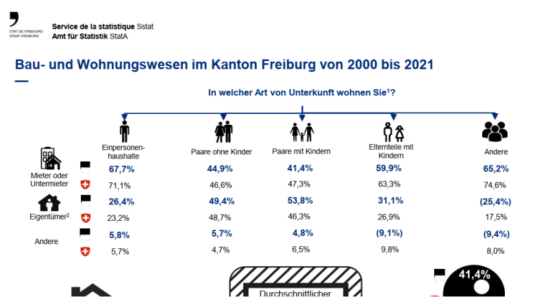 Wie vermutet, hängt das von der Art des Haushalts ab, in dem Sie leben. Alleinstehende Freiburger/-innen in einem Haushalt sind überwiegend Mieter/-innen oder Untermieter/-innen (67,7% im Jahr 2021), geringfügig weniger als im Landesdurchschnitt (71,1%). Andererseits besitzt die Mehrheit der im Kanton lebenden Paare ihr eigenes Zuhause, was bei Paaren mit Kindern auf Landesebene nicht der Fall ist. Die Eigentumsquote der Freiburger Paare beträgt 49,4% für Paare ohne Kinder und sogar 53,8% für Paare mit Kindern, verglichen mit 48,7% und 46,3% auf nationaler Ebene. Alleinerziehende Familien haben weniger Chancen, ein eigenes Haus zu besitzen. Ihre Eigentumsquote sinkt im Kanton Freiburg auf 31,1%, im Landesdurschnitt auf 26,9%. Insgesamt werden 41,4% der Wohnungen im Kanton Freiburg von ihren Eigentümern selbst bewohnt, gegenüber nur 36,3% in der Schweiz.