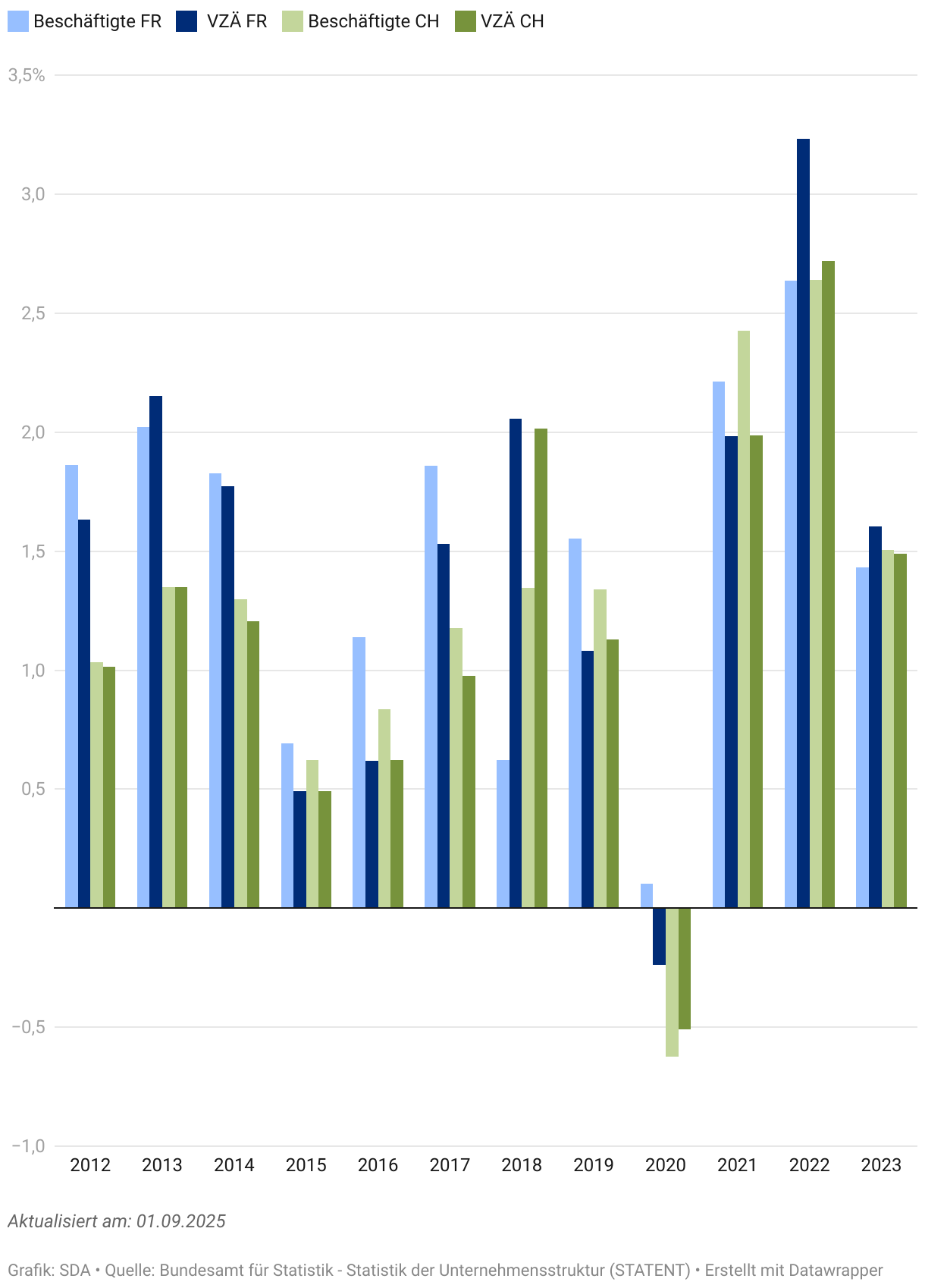 Gemäss der neusten Statistik der Unternehmensstruktur (STATENT) zählte die Freiburger Wirtschaft Ende 2023 insgesamt 166'675 Beschäftigte bei 126'970 Vollzeitäquivalenten (VZÄ). Gegenüber dem Jahr 2022 sind das 2005 VZÄ bzw. 1,6% mehr. Der Zuwachs fiel also weniger stark aus als in den Nach-COVID-Jahren 2021 (+2,0%) und 2022 (+3,2%). Das Beschäftigungswachstum lag im Kanton Freiburg dennoch leicht über dem Landesdurchschnitt (+1,5%).
