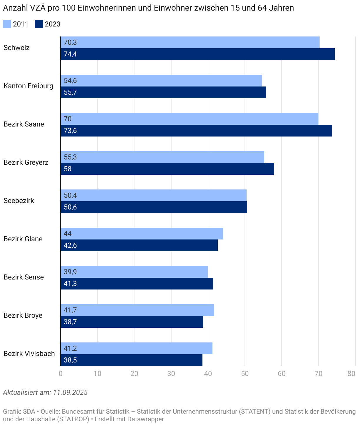 Die Beschäftigungsdichte, ausgedrückt in VZÄ pro 100 Einwohnerinnen und Einwohner zwischen 15 und 64 Jahren, hat im Kanton von 2011 bis 2023 also leicht zugenommen, und zwar von 54,6 auf 55,7. Dieser Wert liegt aber immer noch deutlich unter dem Landesdurchschnitt (74,4). Freiburg bildet das Schlusslicht in der Rangfolge der Kantone – weit hinter Zug (119,5) und Basel-Stadt (116,6).
