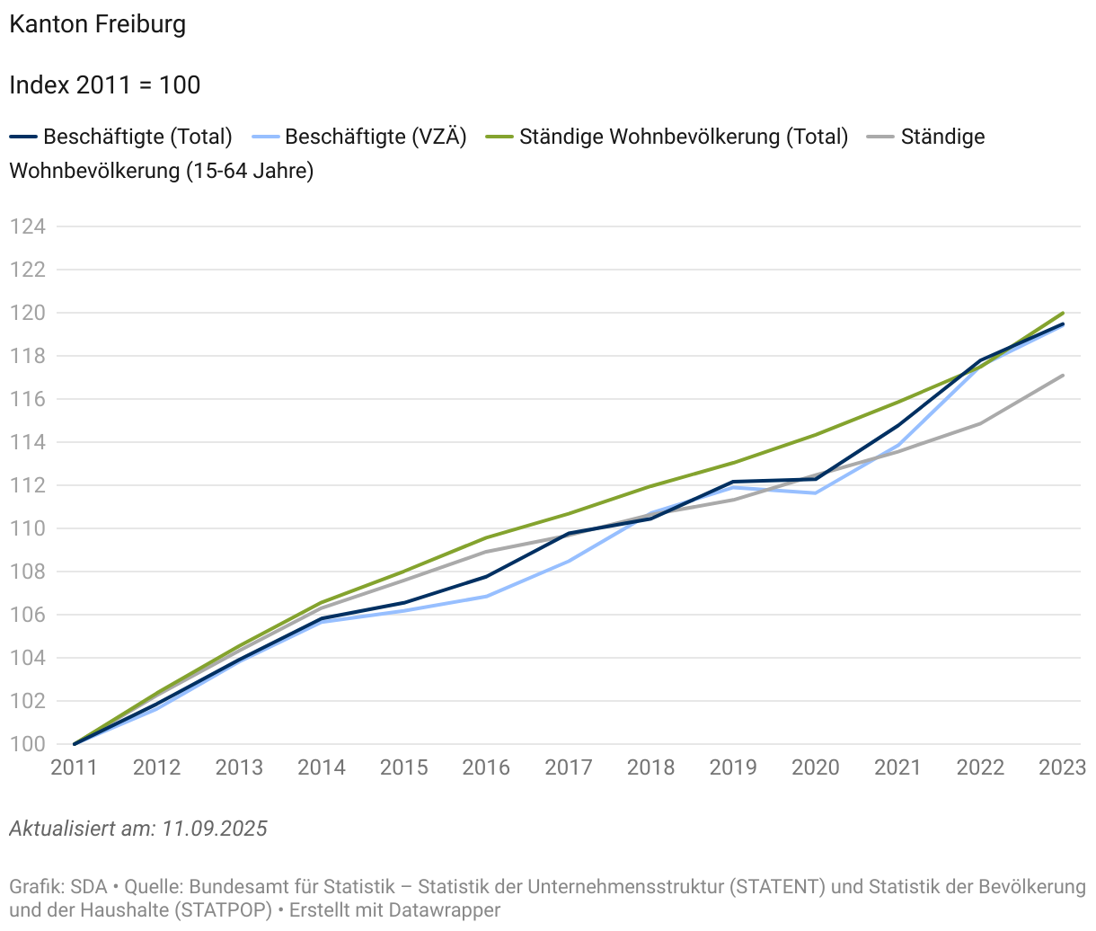 2011-2023: Im Kanton Freiburg folgt die Beschäftigung dem Bevölkerungswachstum