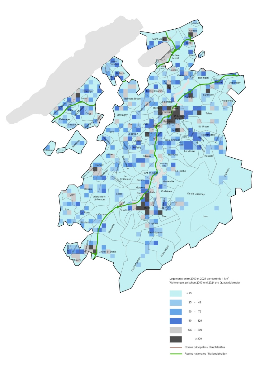 Nach den Ergebnissen der letzten Gebäude- und Wohnungsstatistik zählte der Kanton Freiburg Ende 2024 insgesamt 168'373 Wohnungen, was einem Anstieg von 59,6% gegenüber 2000 (105'511 Einheiten) entspricht.Die kartografischen Analysen zeigen einen deutlichen Anstieg der Dichte in den städtischen Zentren. In der Gemeinde Freiburg, genauer gesagt in den Quartieren Perolles und Plätze, ist die Wohnungsdichte im Kanton am höchsten. Im Jahr 2000 zählten die beiden Quartiere 3555 Wohnungen pro Quadratkilometer. Im Jahr 2024 ist die Dichte auf der gleichen Fläche um 24,5% auf 4425 Wohnungen angestiegen. Der Anteil an dicht besiedelten Gebieten im Kanton (mehr als 300 Wohnungen pro Quadratkilometer) hat um 74,6% zugenommen. Im Jahr 2000 waren es 67 und im Jahr 2024 bereits 117. Diese Gebiete konzentrieren sich hauptsächlich auf die Gemeinden Freiburg, Bulle, Villars-sur-Glâne, Marly, Düdingen, Murten, Châtel-Saint-Denis und Estavayer. Eine etwas weniger starke Verdichtung (130-300 Wohnungen/km2) ist auch in den Dorfzentren entlang der Verkehrsachsen Freiburg-Romont und Freiburg-Bulle zu beobachten. An den Ufern des Murten- und des Neuenburgersees wird, ausser in Estavayer und Murten, etwas weniger dicht gebaut (80-130 Wohnungen/km2). Allgemein zeigt die Entwicklung des Wohnungsbestands seit 2000, dass die Verdichtung vor allem in den Stadtzentren stattfindet, während sie im ländlichen Raum schwach bleibt.
