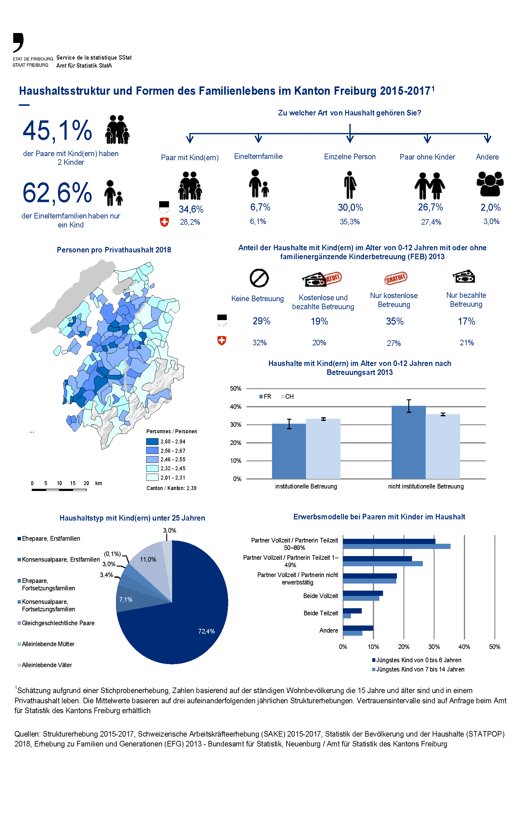Im Kanton Freiburg besteht jeder dritte Haushalt aus einem Paar mit Kind(ern) (34,6%), ein deutlich höherer Anteil als im Landesdurchschnitt (28,2%). Diese Haushaltsform ist bei uns nach wie vor die häufigste. An nächster Stelle kommen die Alleinstehenden mit 30,0% und die Paare ohne Kinder (26,7%). Schließlich besteht ungefähr jeder fünfzehnte Haushalt (6,7%) aus einer Einelternfamilie. Fast jedes zweite Freiburger Paar mit Kindern hat zwei Kinder, während die meisten Einelternfamilien nur ein Kind haben (62,6%). Bei den Familienhaushalten mit Kindern unter 25 Jahren ist die traditionelle Familie, bestehend aus einem verheirateten Vater und einer verheirateten Mutter, im Kanton Freiburg nach wie vor das vorherrschende Modell (72,4%). Es folgen die alleinlebenden Mütter (11,0%), die Erstfamilien von Konsensualpaaren (7,1%), die Fortsetzungsfamilien von Ehepaaren (3,4%), die Fortsetzungsfamilien von Konsensualpaaren (3,0%), die alleinlebenden Väter (3,0%) und homosexuelle Paare (0,1%). In den meisten Haushalten mit bis zu 14 Jahren alten Kindern sind beide Partner erwerbstätig. In den meisten Fällen ist der Mann vollzeiterwerbstätig, während die Frau zu 50% bis 89% teilzeiterwerbstätig ist. Das Modell der Teilzeitarbeit beider Partner ist weit weniger verbreitet. Das Alter des Kindes beeinflusst die Beschäftigungsquote der Eltern, insbesondere die der Mutter.