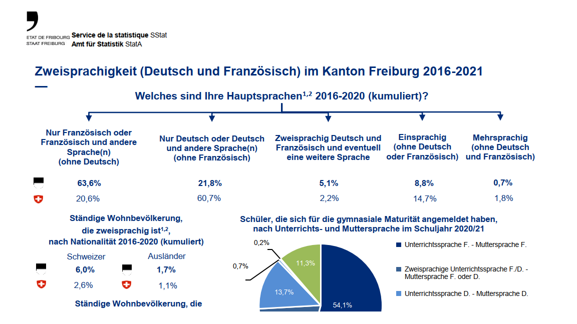 Der Kanton Freiburg hat zwei Amtssprachen: Französisch und Deutsch. Wie aus seinem neuen Regierungsprogramm (2022-2026) hervorgeht, will der Staatsrat die Zweisprachigkeit als wichtigen Trumpf unseres Kantons fördern. Da heute in unserem Kanton der Tag der Zweisprachigkeit ist, liefert das Amt für Statistik (StatA) einige interessante Zahlen zum Thema.