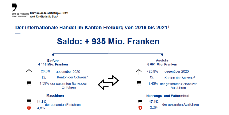Der Kanton Freiburg weist für 2021 eine positive Handelsbilanz auf (+935 Mio. Franken). Die Datenverarbeitungsgeräte und die elektronischen und optischen Erzeugnisse (+473 Mio. Fr.), die pharmazeutischen Erzeugnisse (+467 Mio. Fr.) sowie die Nahrungs- und Futtermittel (+435 Mio. Fr.) haben den grössten Beitrag an den Handelsbilanzüberschuss des Kantons Freiburg geleistet. Demgegenüber ist das Handelsbilanzdefizit bei den chemischen Erzeugnissen wie bereits in den Vorjahren sehr hoch (-214 Mio. Fr.).